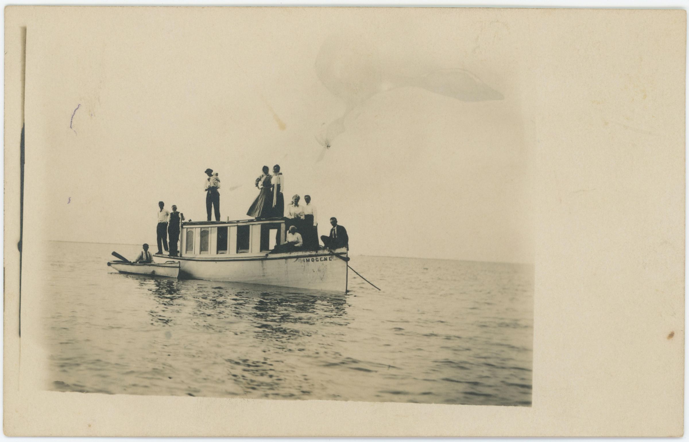 A group of people on the schooner, "Imogene." A small boat is tied to the schooner.