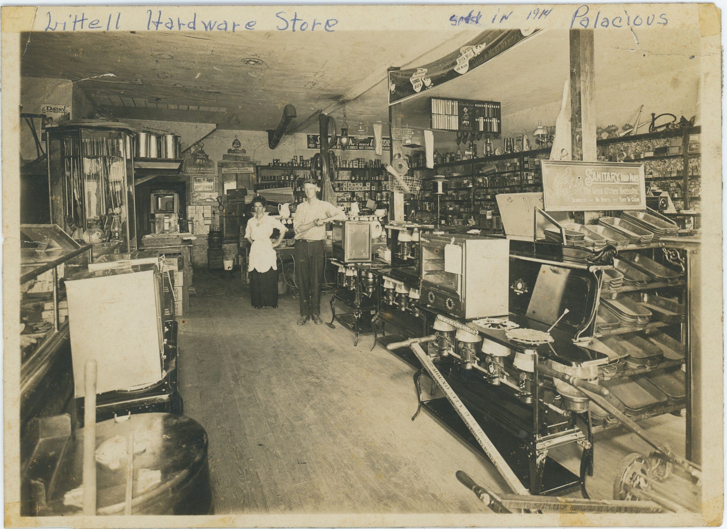 The woman in the apron was Vonnie Littell and the man was a clerk. Lawn mowers, stoves, paint, and more hardware supplies.
