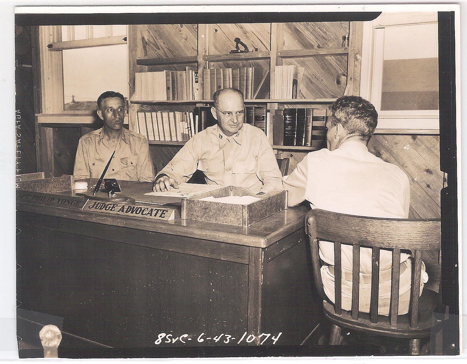 Photograph of two soldiers sitting on either side of the judge advocate, Philip Yonge