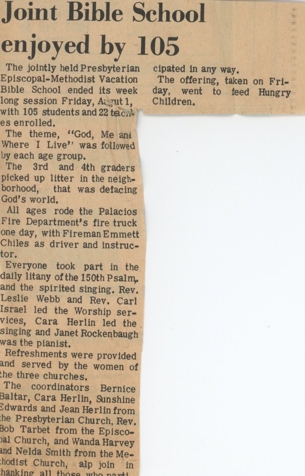 Joint Bible School Enjoyed by 105