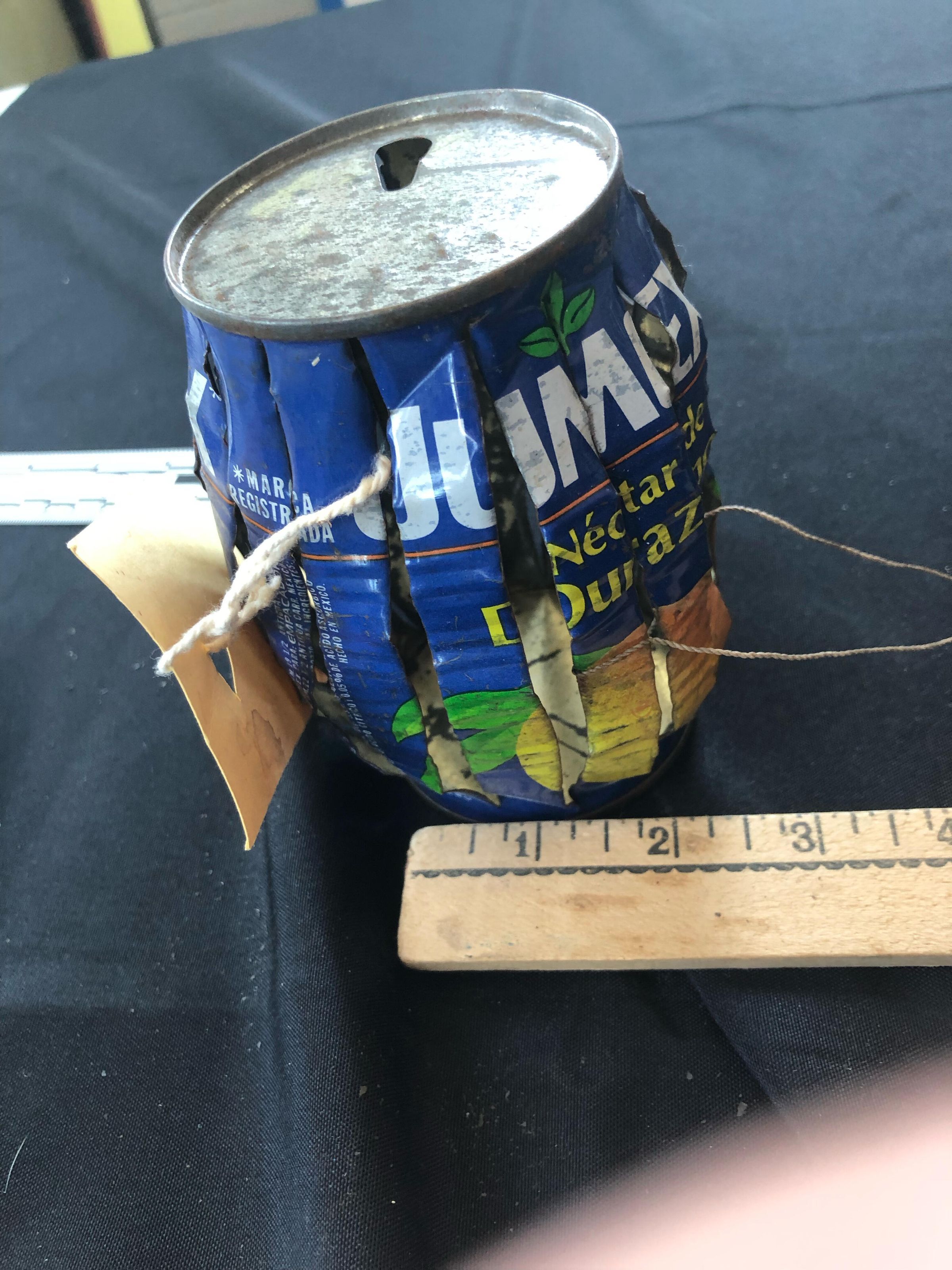 Jumex can with a string attached so it can hang from something