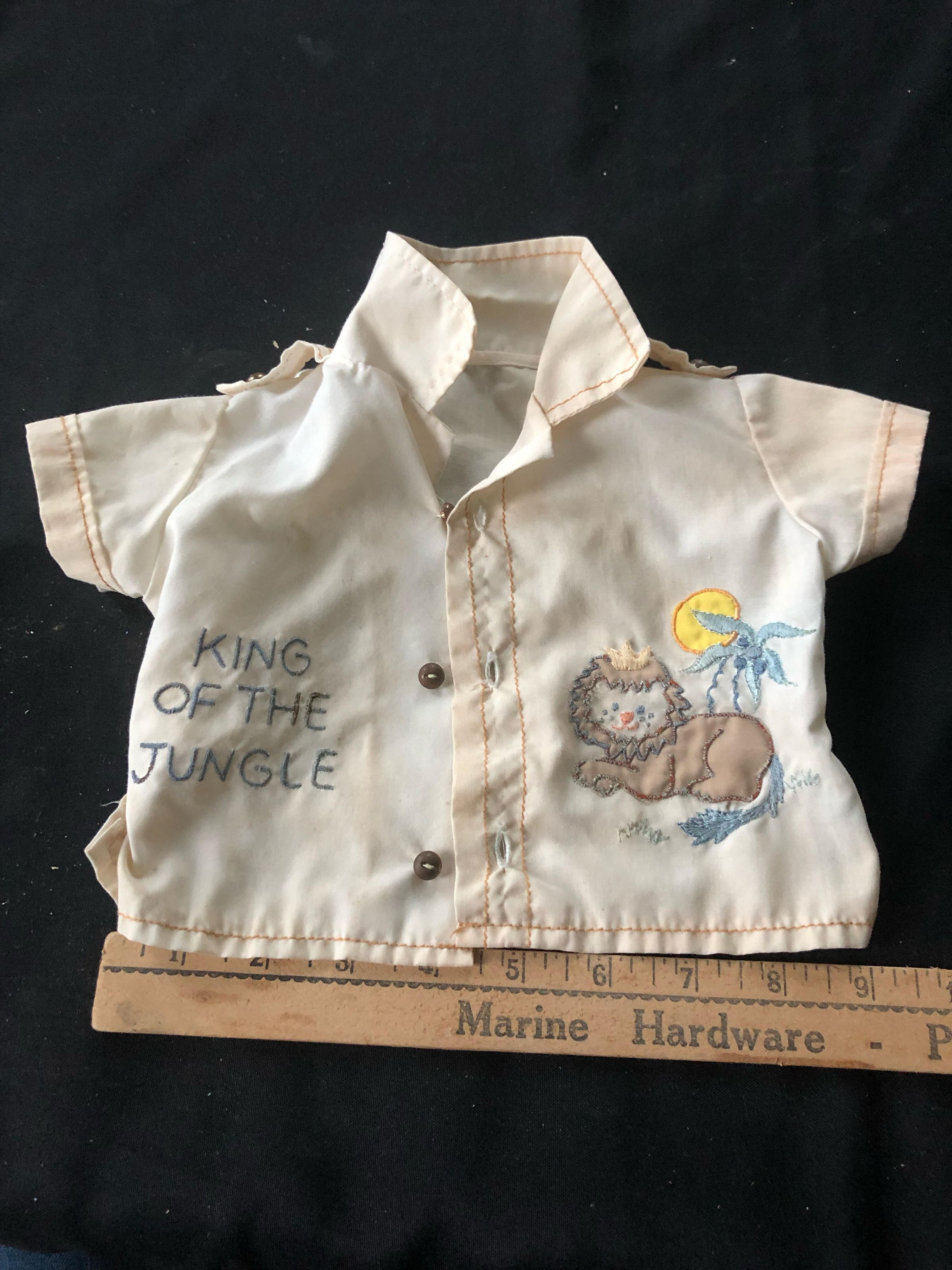 White button up with an embroidered lion, palm tree, and sun on the right side and the words "King of the Jungle" made for a a toddler or babyCollection