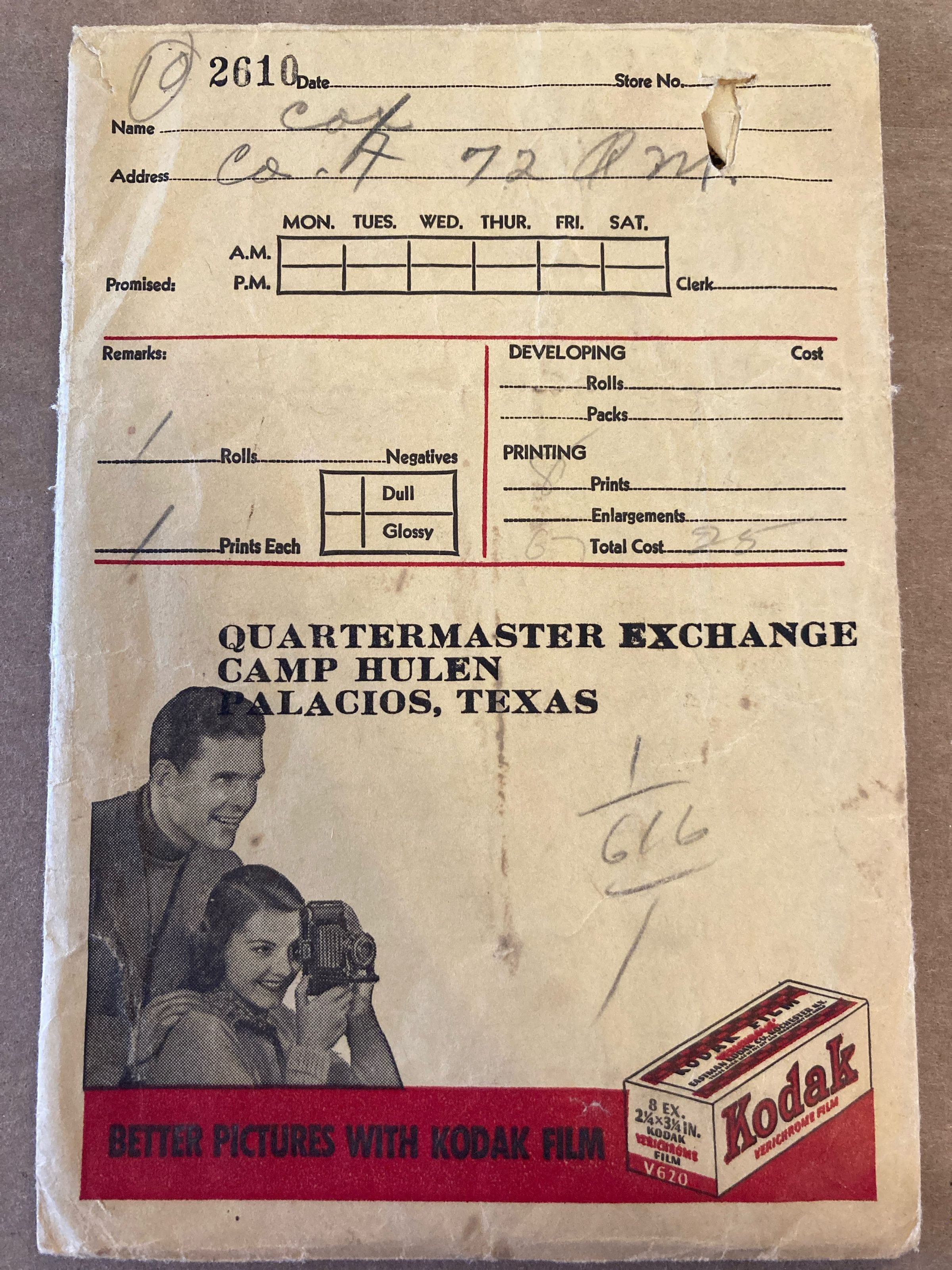 Yellow envelope with the words: Quartermaster Exchange Camp Hulen Palacios, Texas