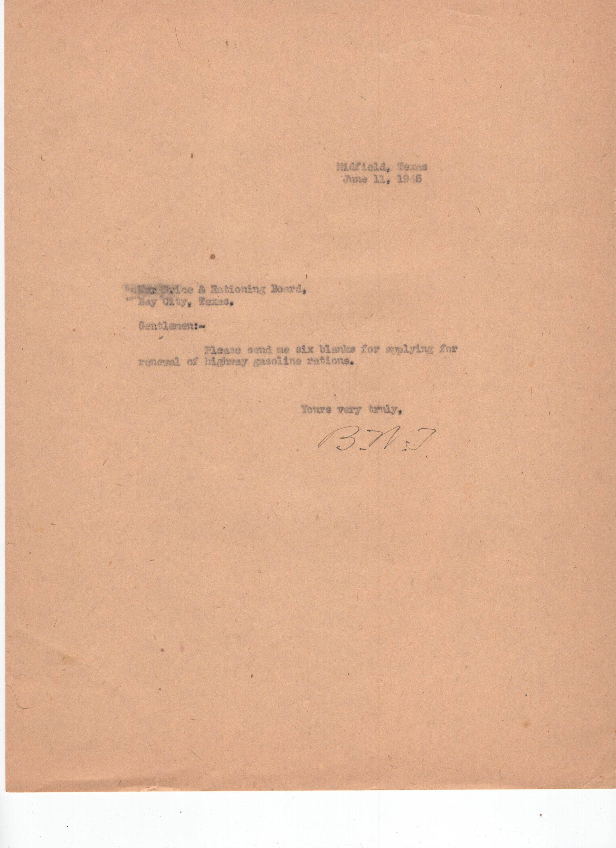 Asking for 6 blanks for applying for renewal of highway gasoline rations.