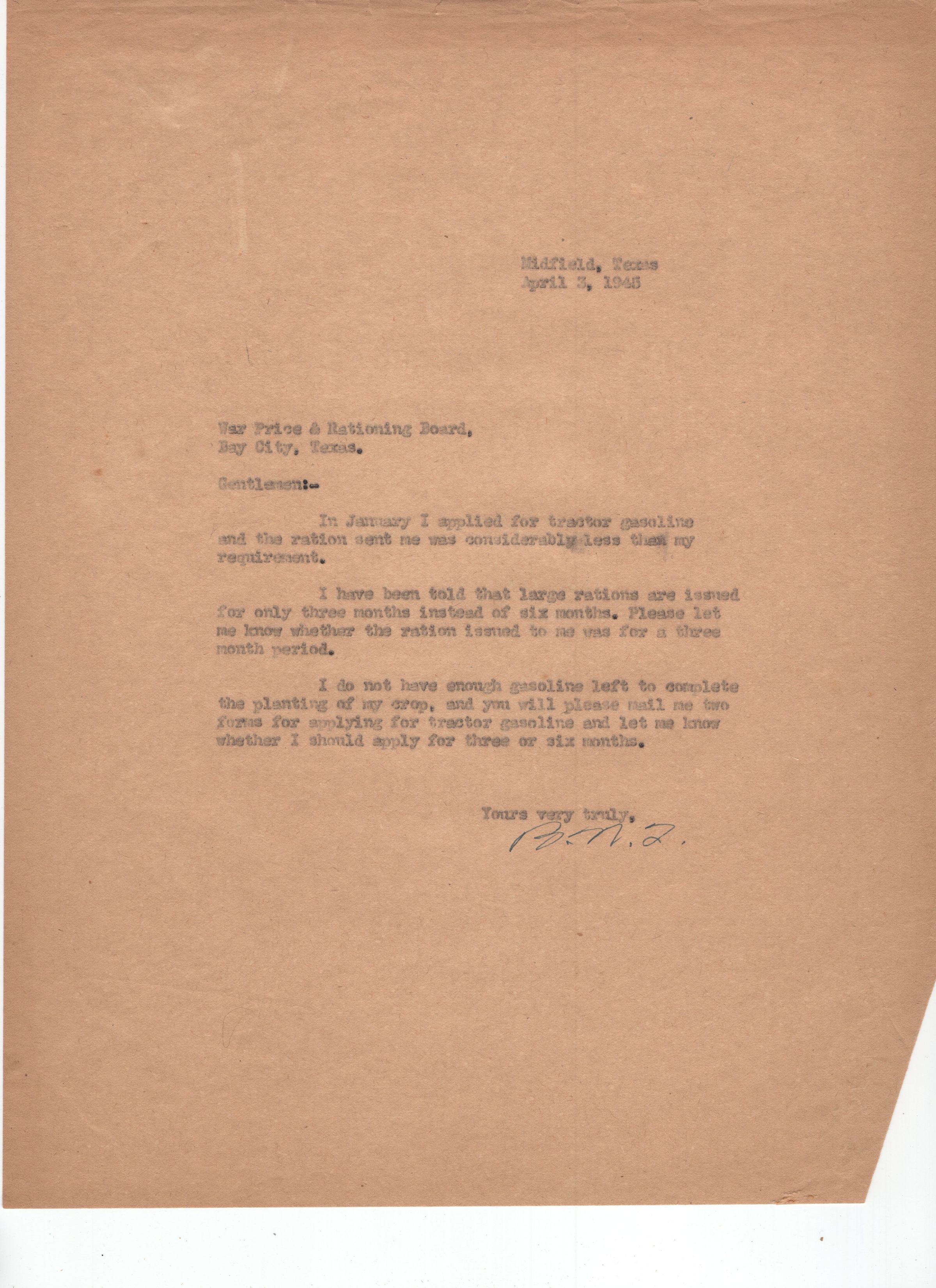 Letter about tractor gasoline less than required amount. Trull also asks to be notified if he got the 3 month ration or the 6 month ration.