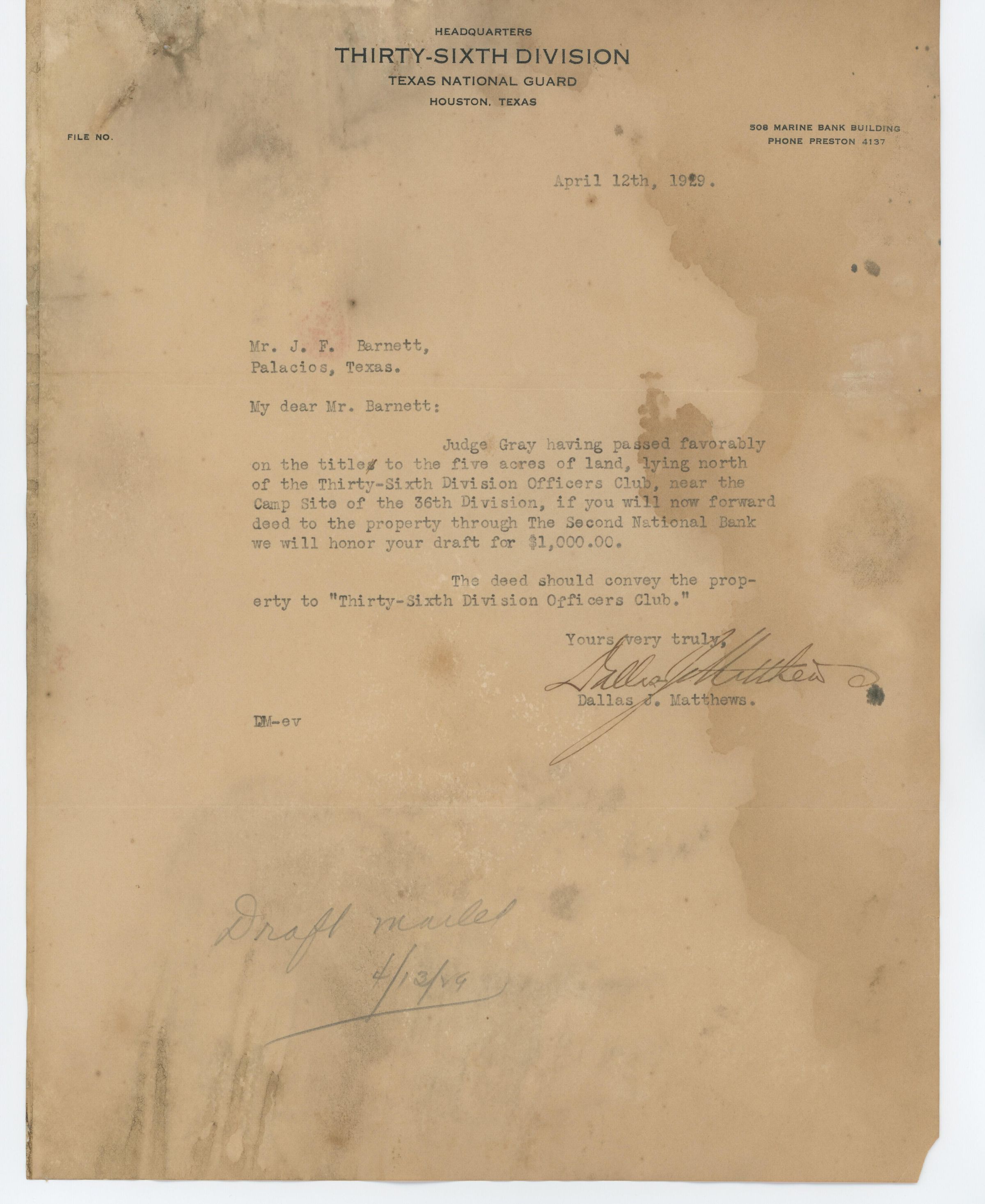 Judge Gray passed favorably the title of land from Mr. Barnett to the 36th Division Officers Club.