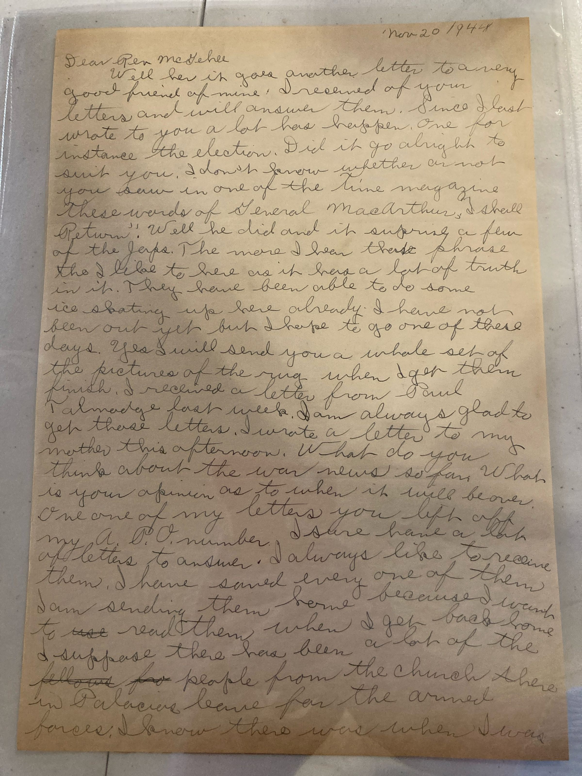 Letter Glenn M Dunigan to Rev McGehee 20 Nov. 1944