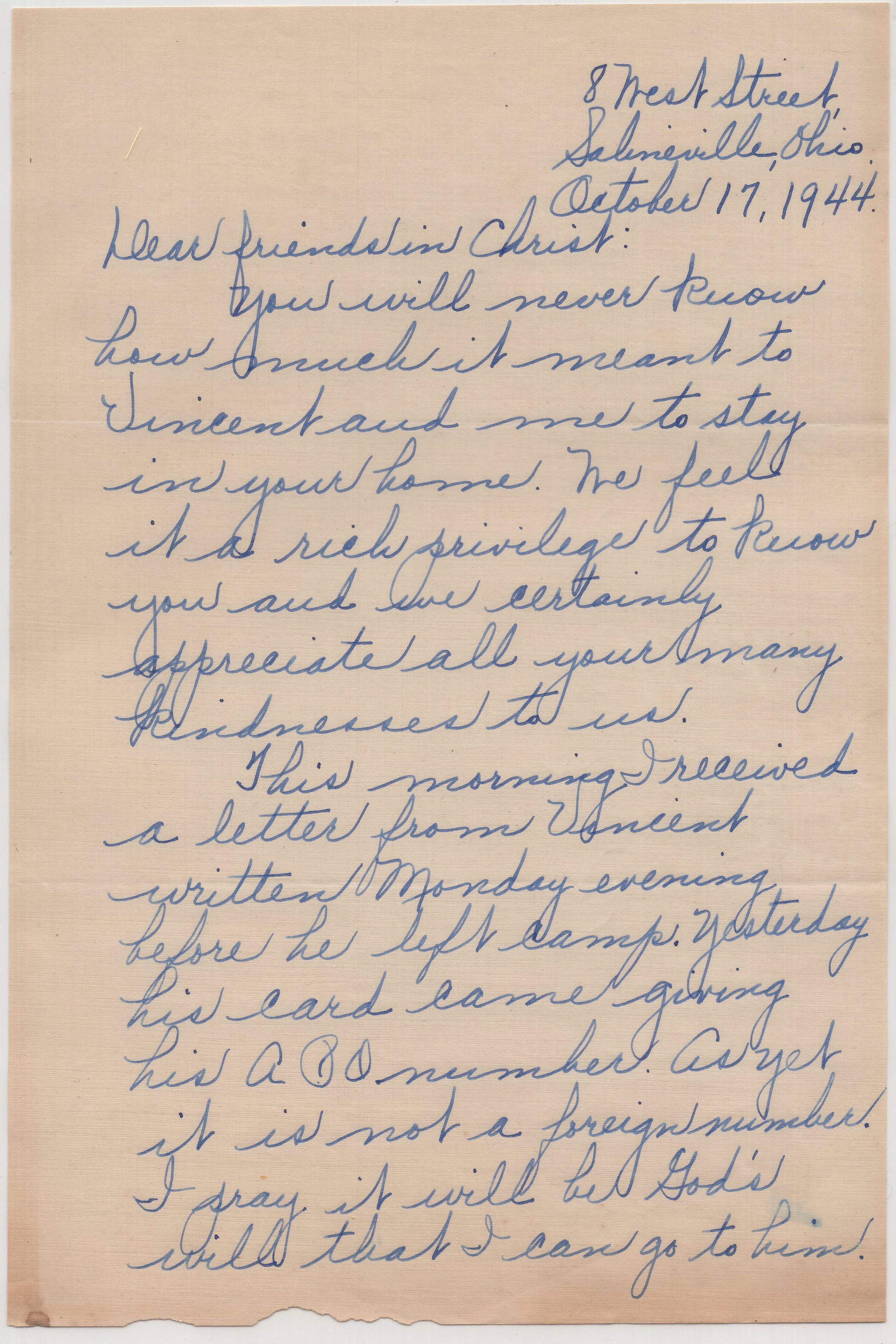 17 Oct. 1944, Marjorie and her husband [?] Vincent stayed with the McGehees and is thanking them; also mentions that Vincent has left campCollection