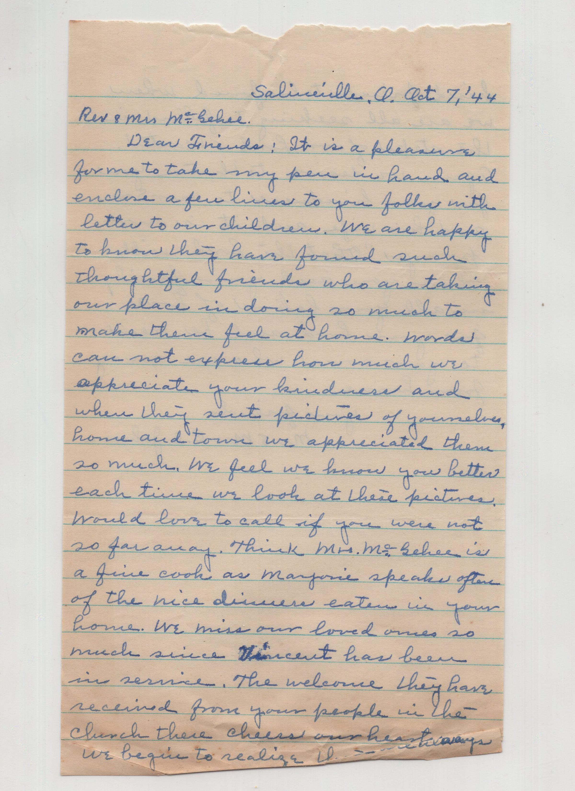 7 Oct. 1944; this letter was enclosed with letter from Marjorie to McGehees (Oct. 17, 1944); Marjorie's parents are thanking McGehees for their kindnessCollection