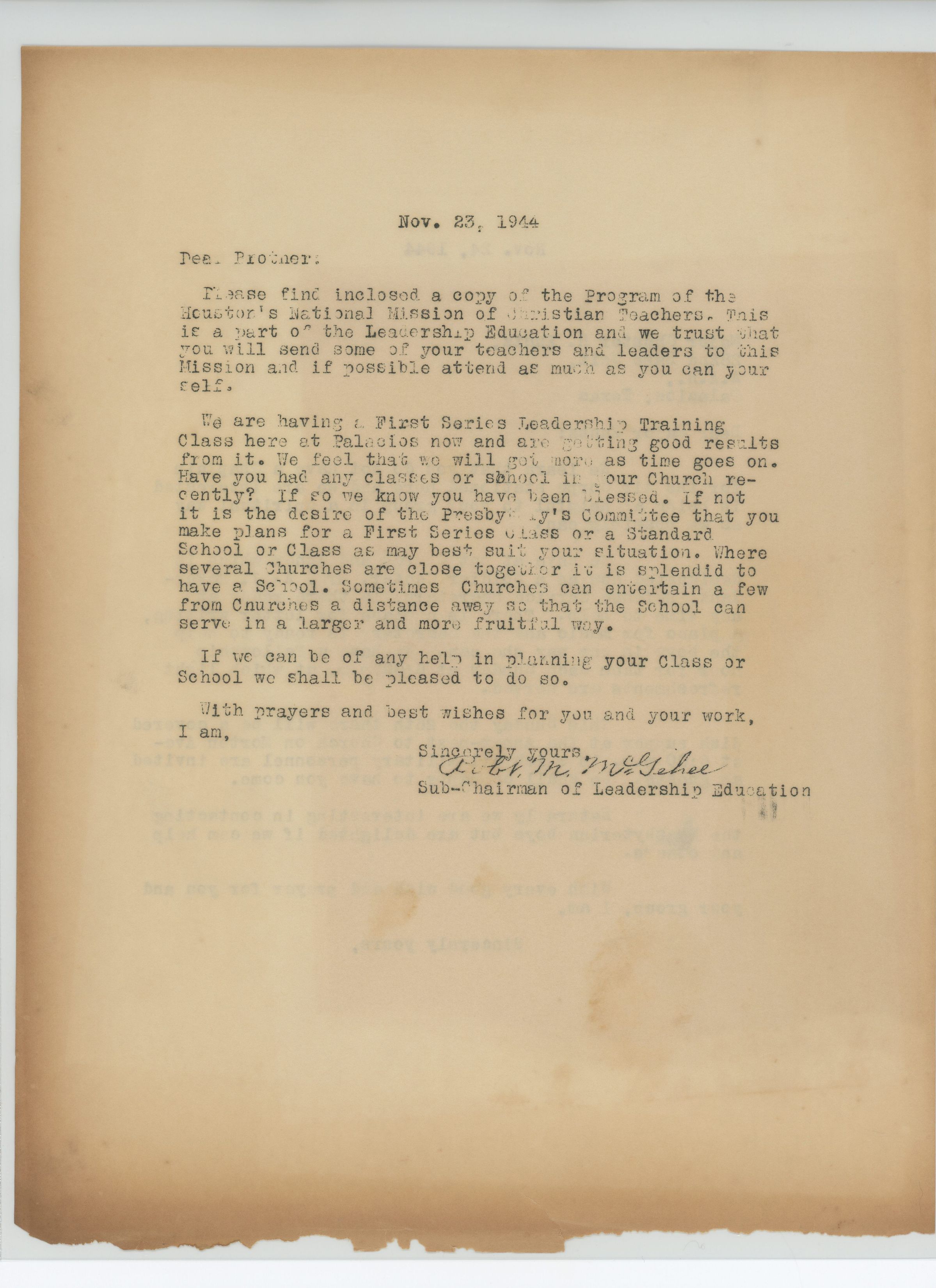 1944; concerning Houston's National Mission of Christian Teachers and "First Series Leadership Training Class" in PalaciosCollection