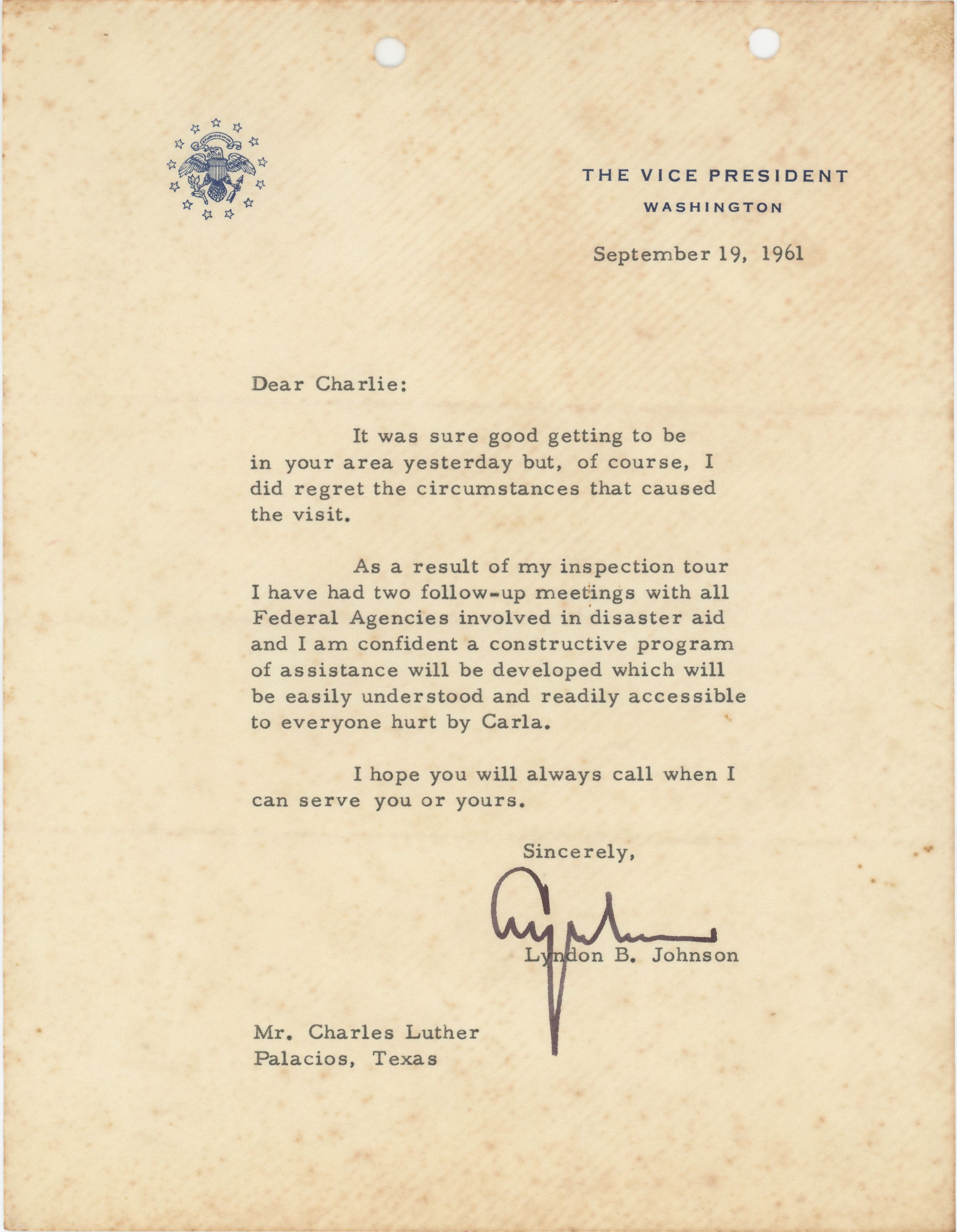 It was sure good getting to be in your area yesterday, but of course, I did regret the circumstances that caused the visit. As a result of my inspection tour I have had two follow-up meetings with all Federal Agencies involved in disaster aid and I am confident a constructive program of assistance will be developed which will be easily understood and readily accessible to everyone hurt by Carla. I hope you will always call when I can serve you or yours.Date(s) of Creation