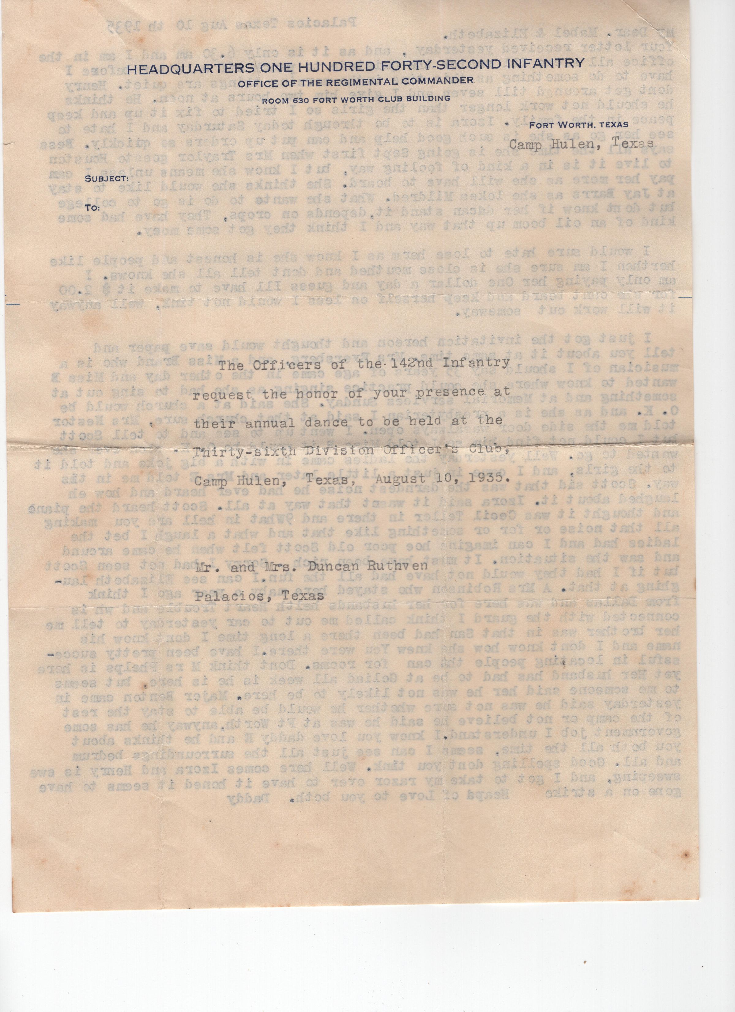 Letter to Mabel and Elizabeth along with invitation to the dance at the 36th Division Officer's Club, Camp Hulen, Palacios, Texas.