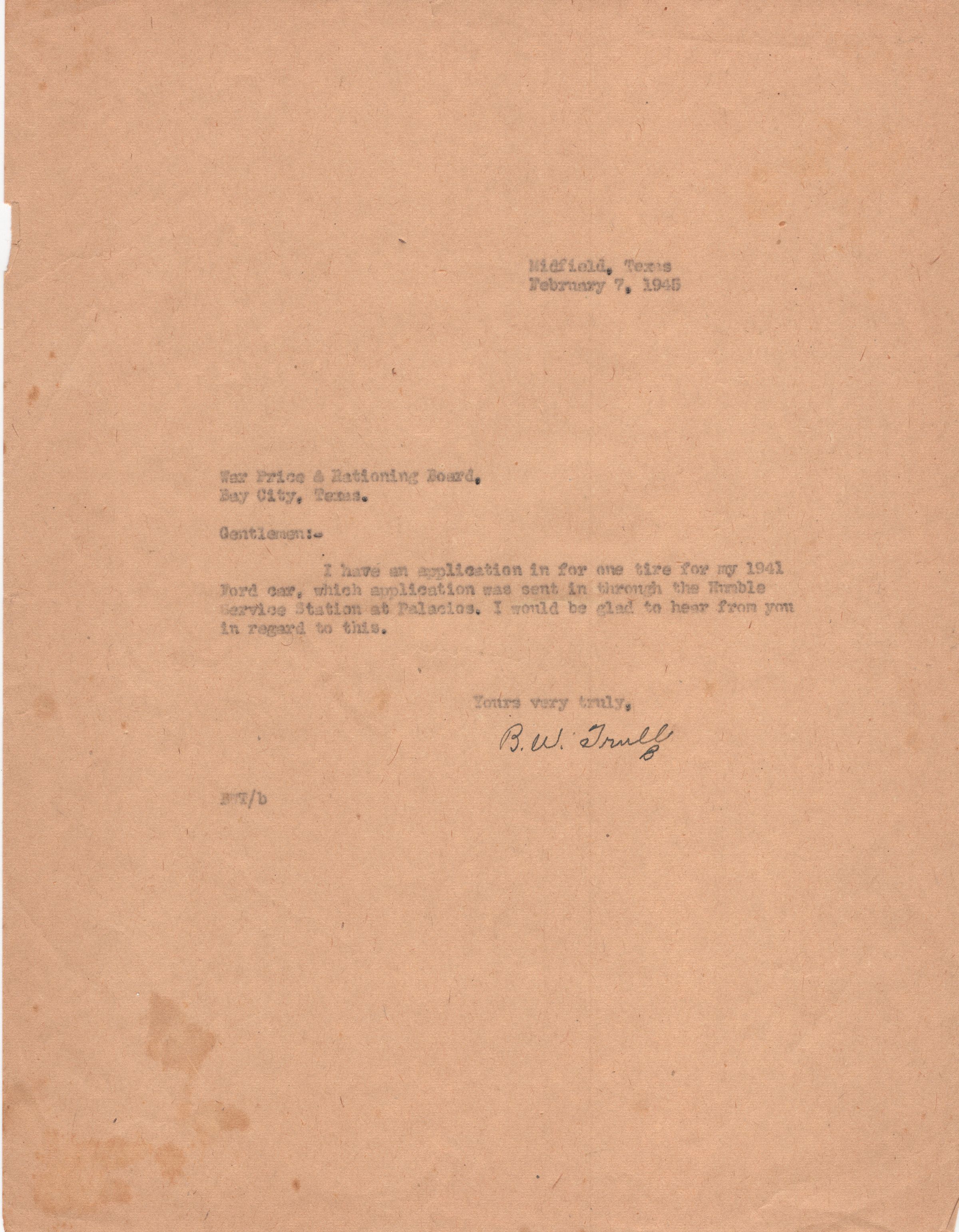 B.W. Trull letter to War Price and Rationing Board. Trull is writing about a submitted tire application for his 1941 Ford car.