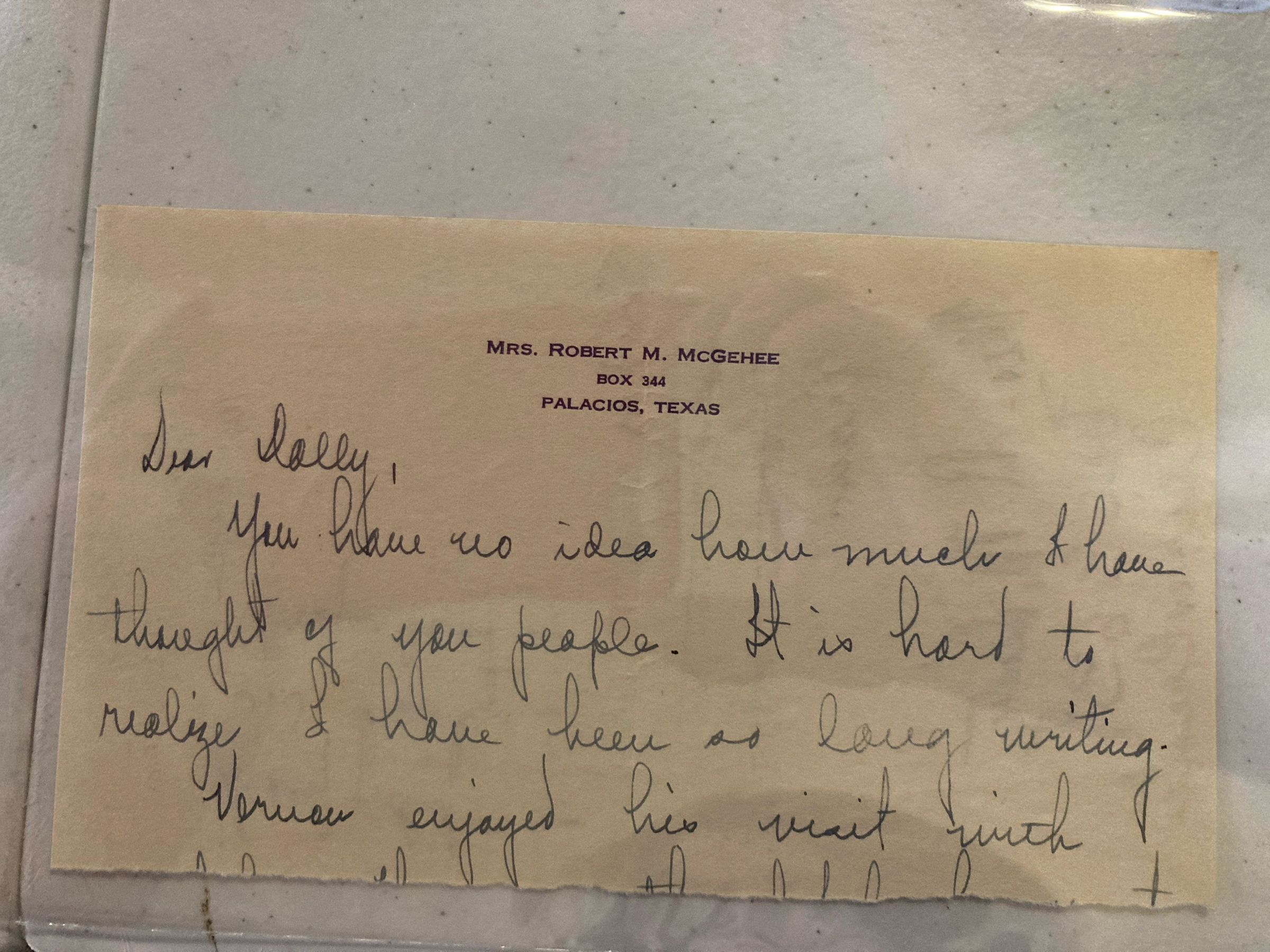 Looks like Mrs. McGehee started a letter to "Dolly" [or was this a letter to her? I'm not sure what her first name is] on the front but the letter has been torn. Handwritten address is on back: Mrs. R.M. Dietz Box 363 Corpus Cristi [sic]Collection