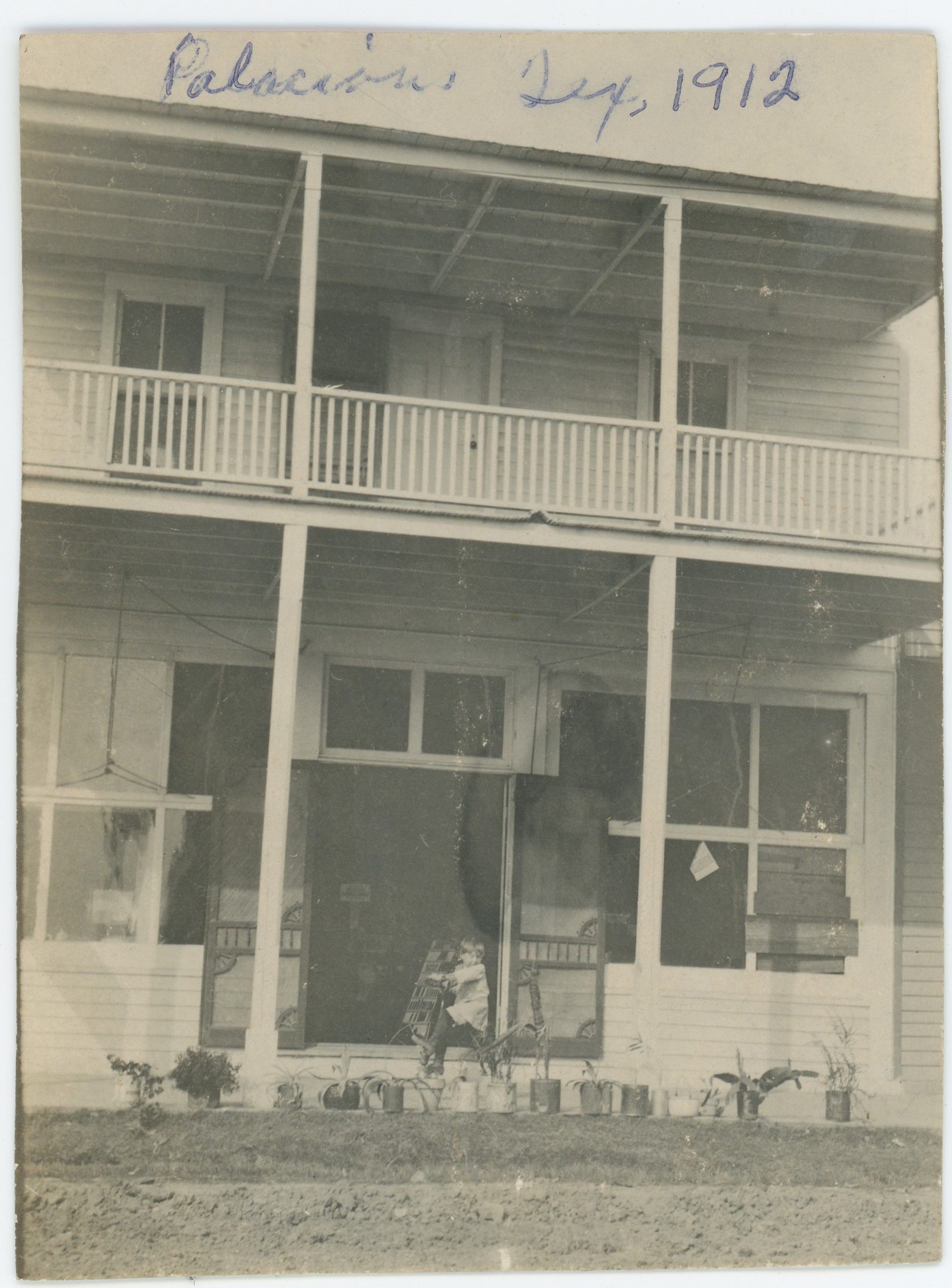 2-Storey white framed building that the Littell family worked and lived in. A little boy is on his trike in front of the store.