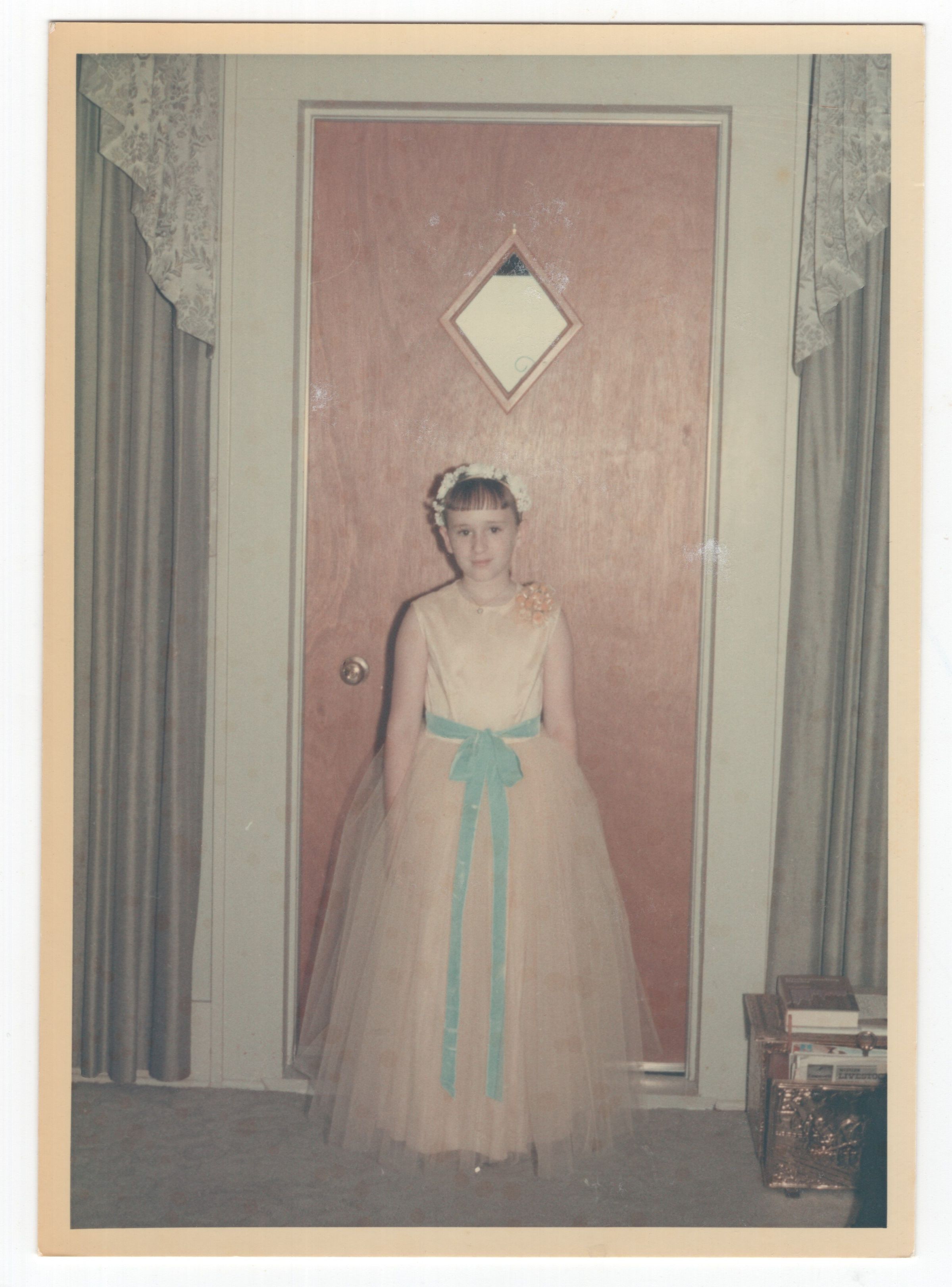 A girl in a yellow dress with a blue bow standing in front of a door.