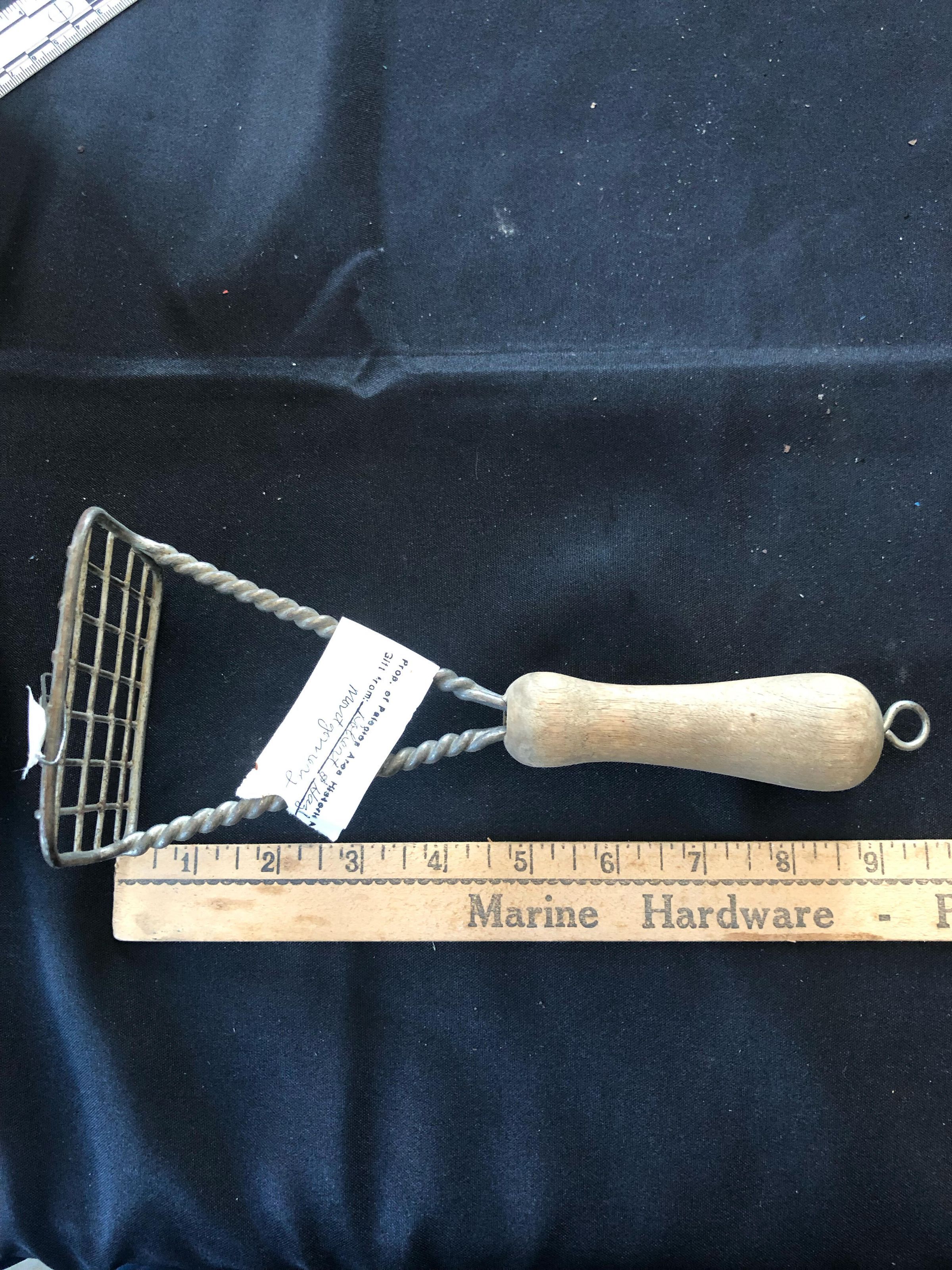 A masher with a metal grated top with two spiraled metal stems connecting to the wooden handle with a metal ring on the bottom, assumingly used to hang this masher on a wall or something similar for storage purposesCollection