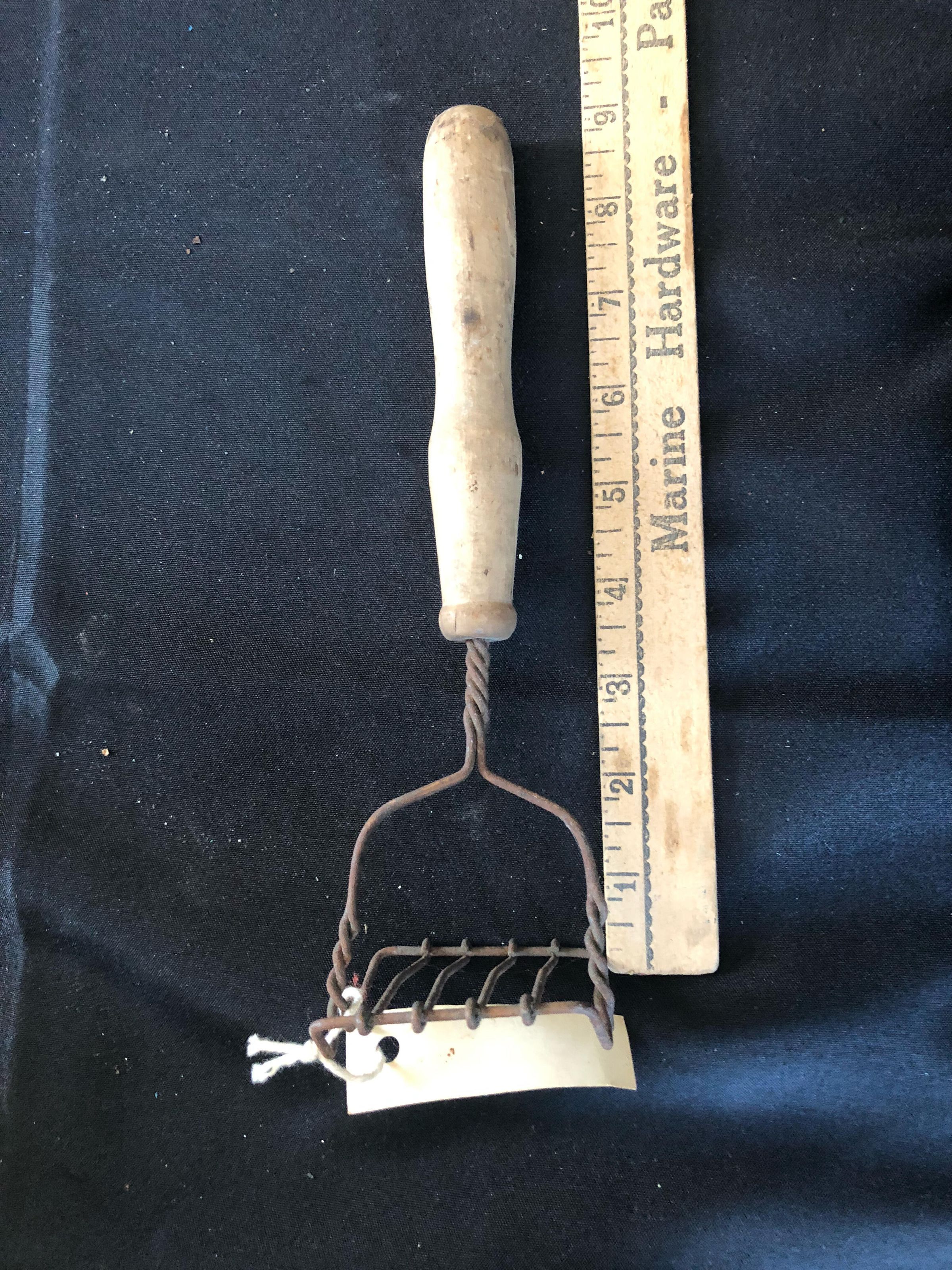 Metal masher with rusted grating on the top and is connected to a wooden handle with a spiraled metal stem