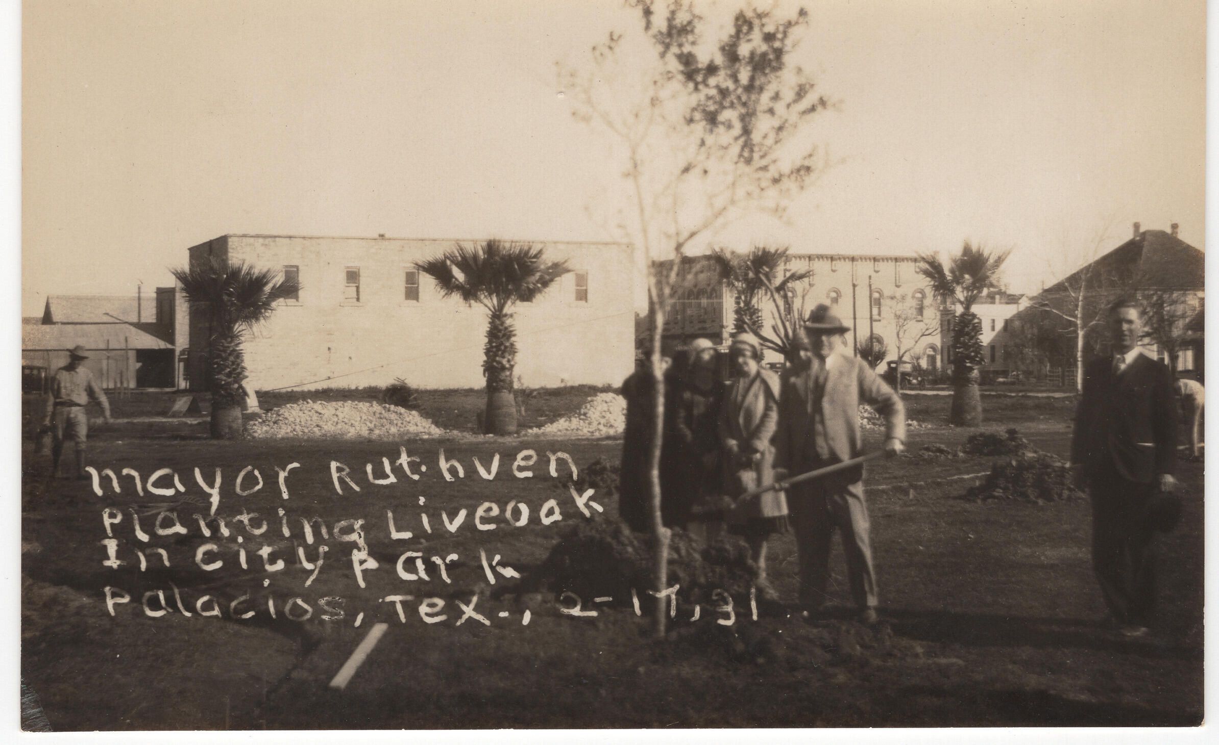 Mayor Ruthven planting Live Oak in City Park, Palacios, Tx 2-17-31