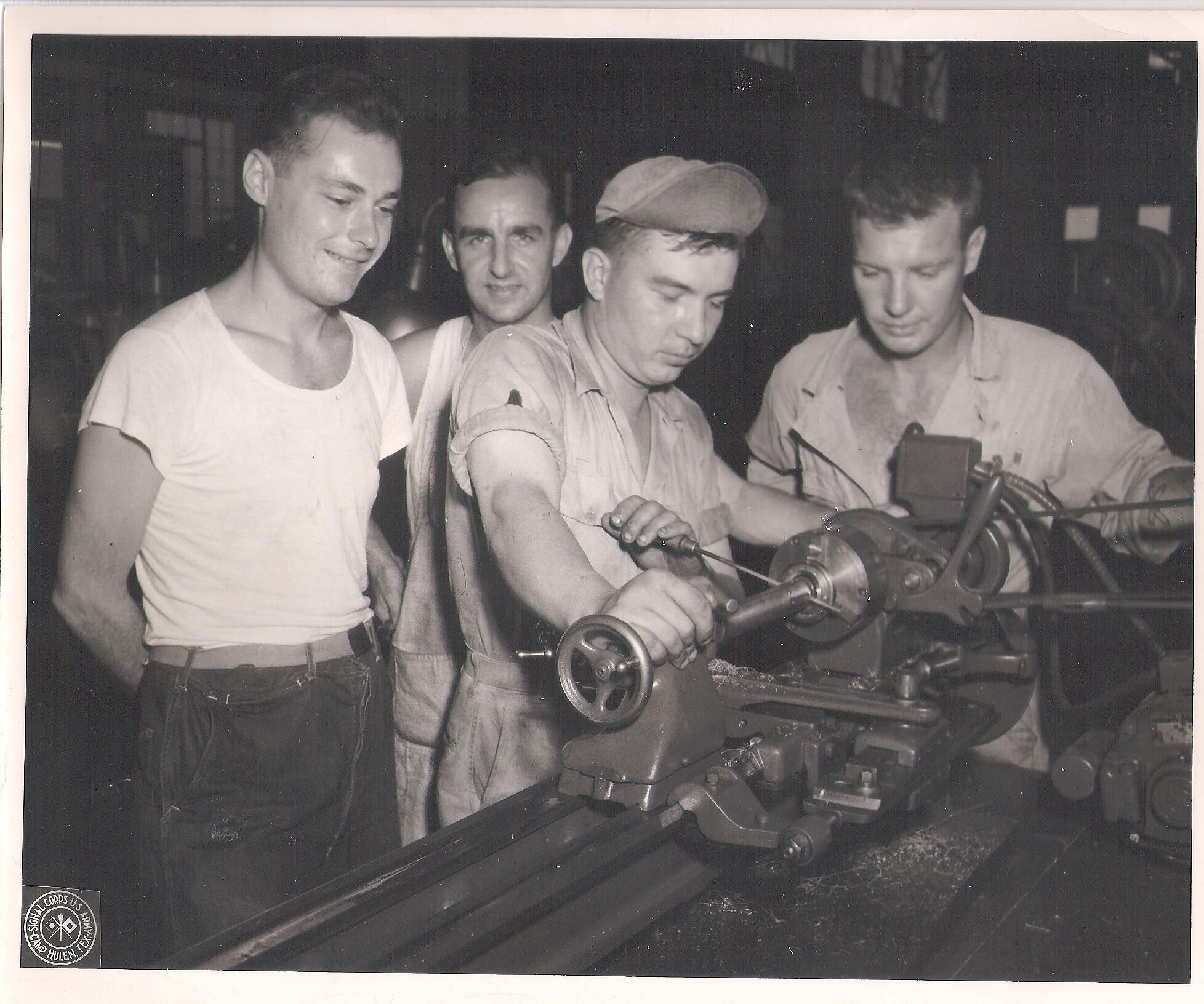 T/5 Mike Urban armament shop machinist shown demoing his brain child device for reconditioning warn cans which earned for him his stripes.