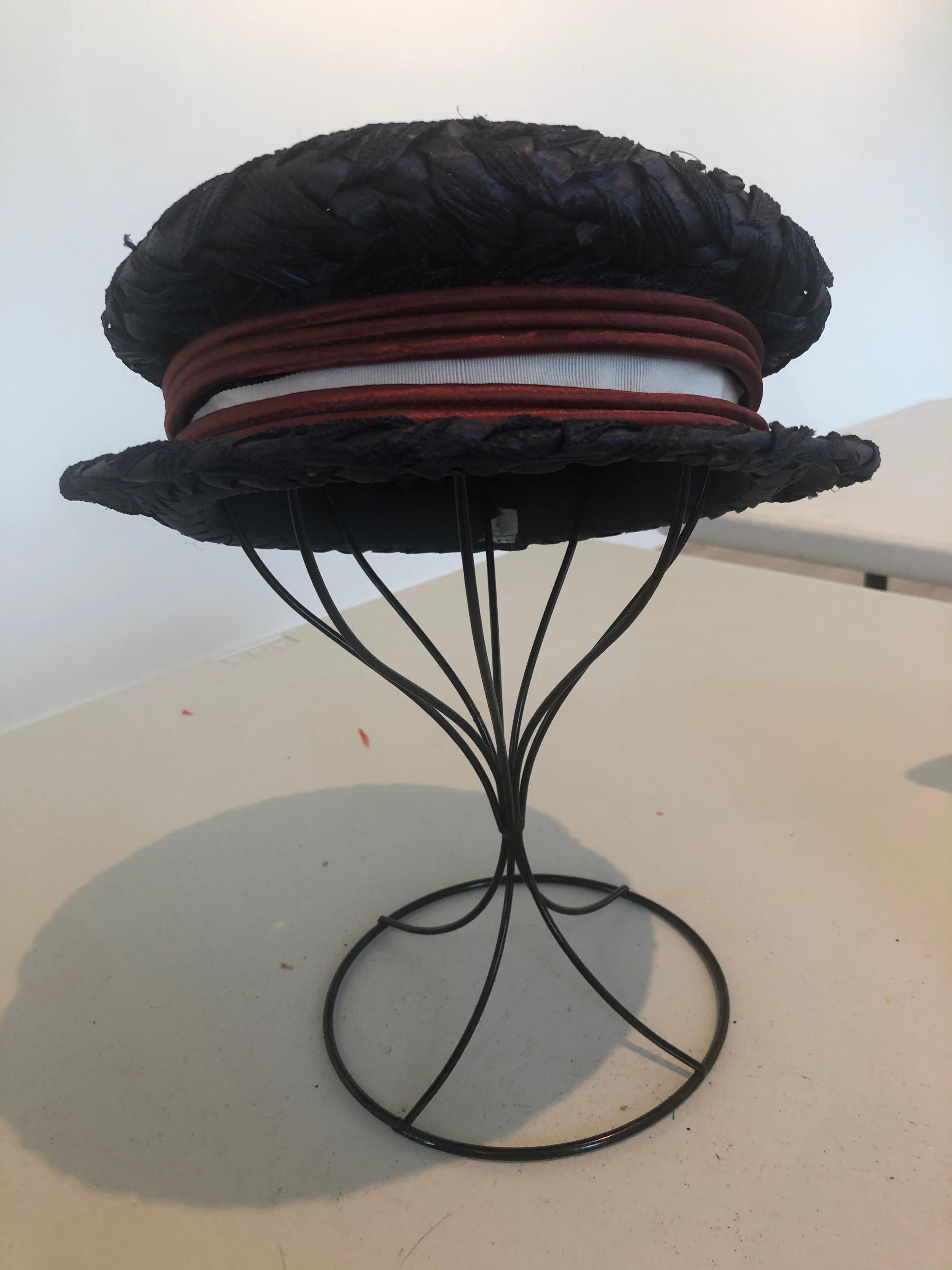 Navy straw hat with a white ribbon and red cords surrounding the centerClothing/Dress/Costume Details
