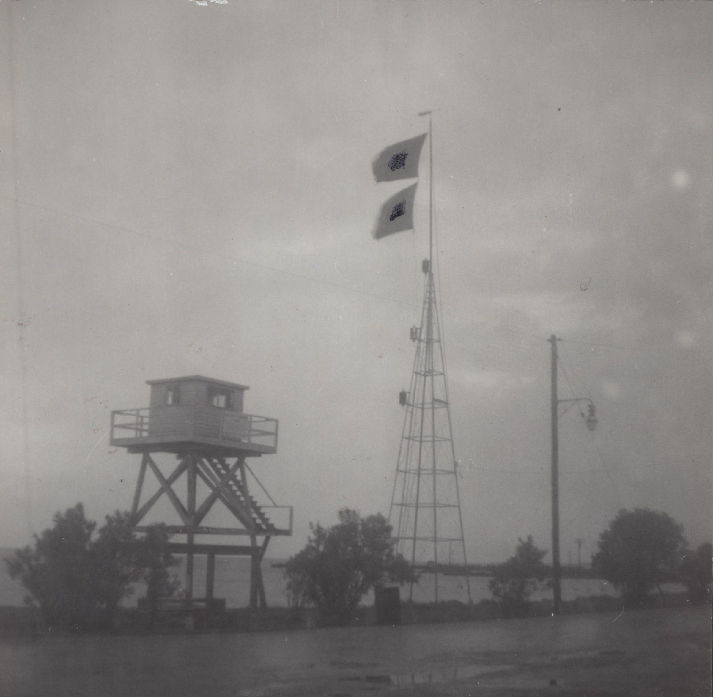 In Palacios, on September 10, 1961, flags denoting the approach of a full-force hurricane were flying--the day before Carla struck and destroyed both the signal display tower and the nearby tower which was used by observers watching for enemy aircraft during World War II.Collection