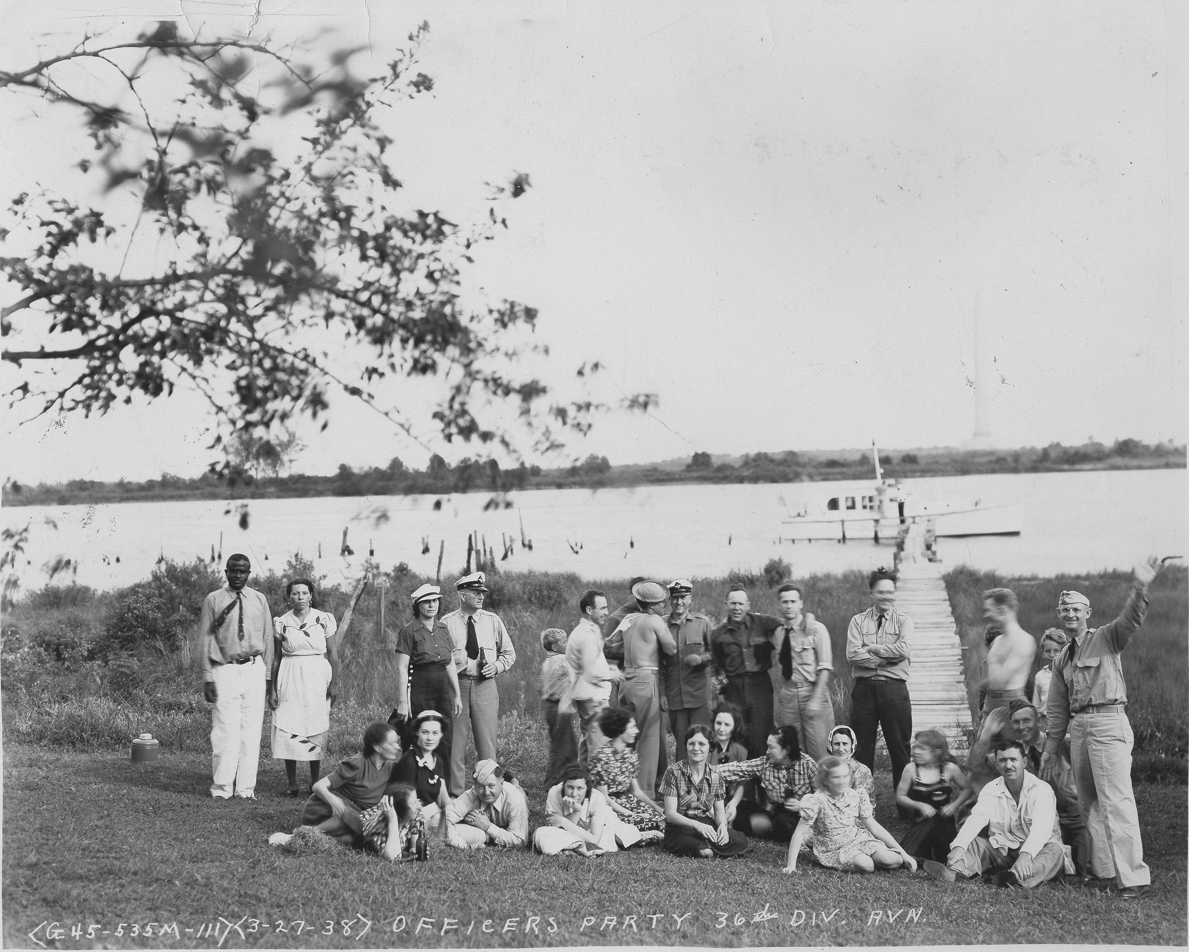 Officer's Party, 36th Division. Men and women posing in front of the pier with a boat in the background. Two individuals on the back left side appear to be a butler and maid.Collection