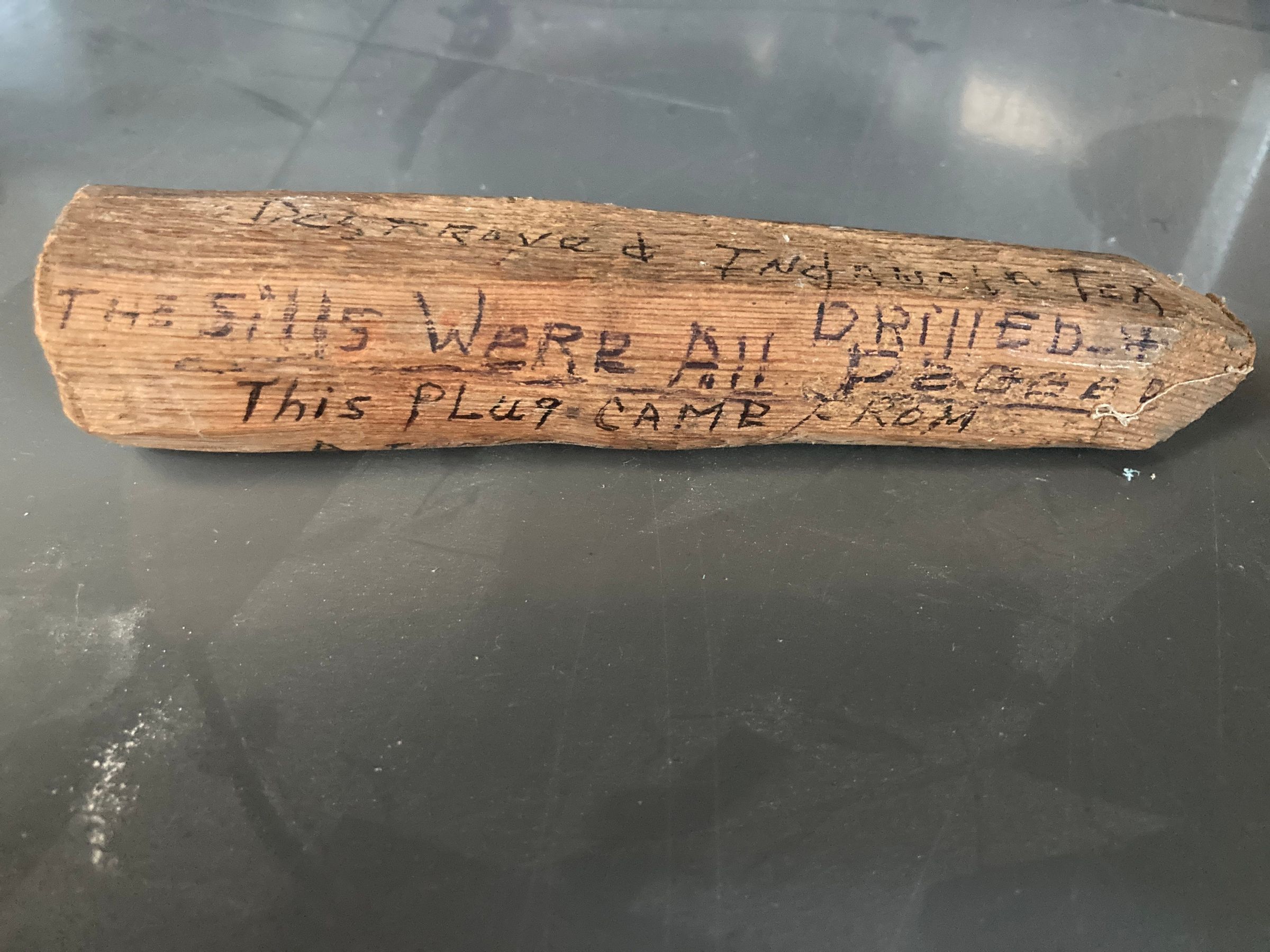 This plug came from a two-story house west of West Cronkway (Carancahua) River. The house was torn down at Indianola and moved by barge. The sills were all drilled and pegged.