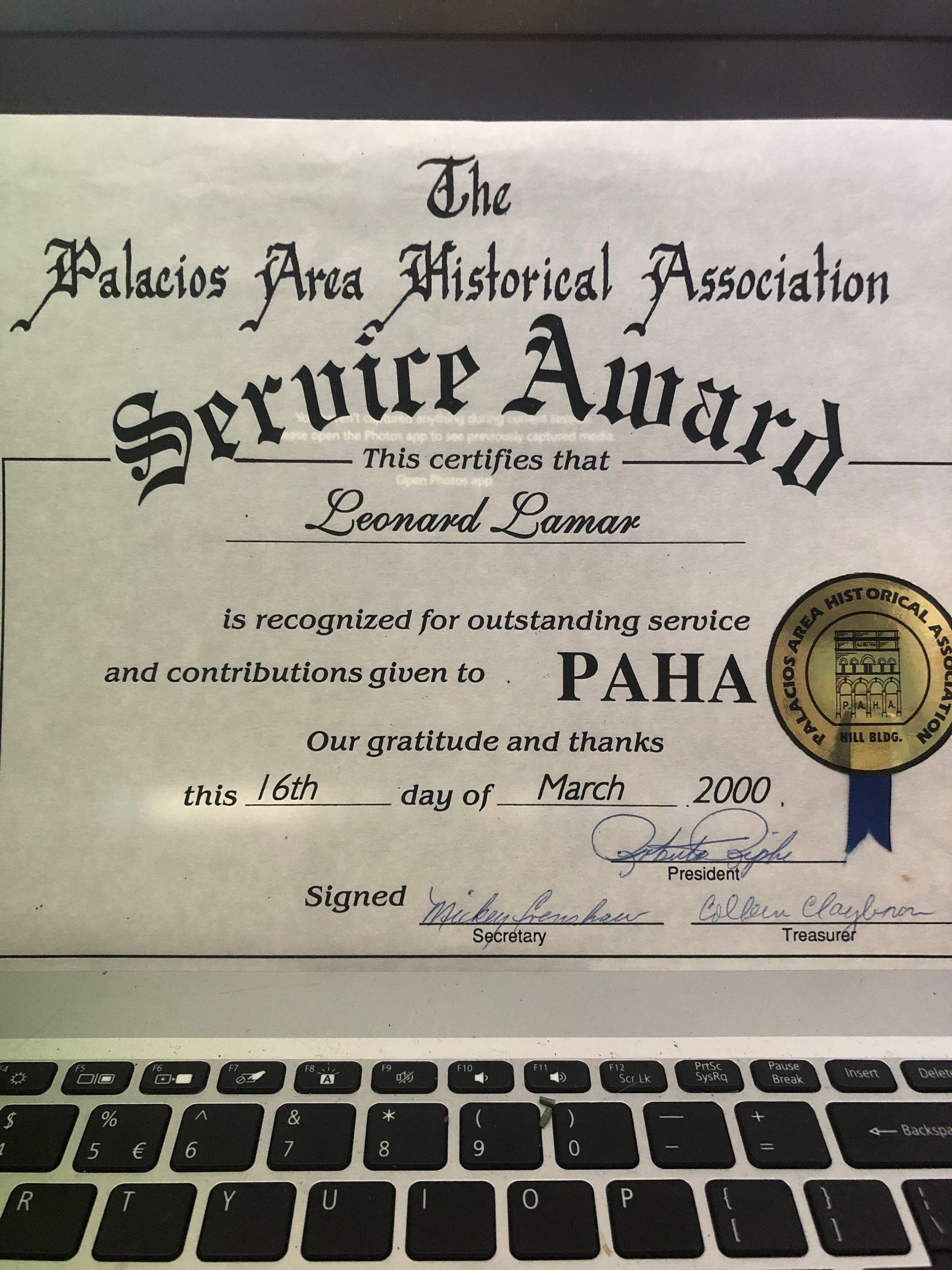 Recognized for outstading service and contributions given to PAHA: March 16, 2000