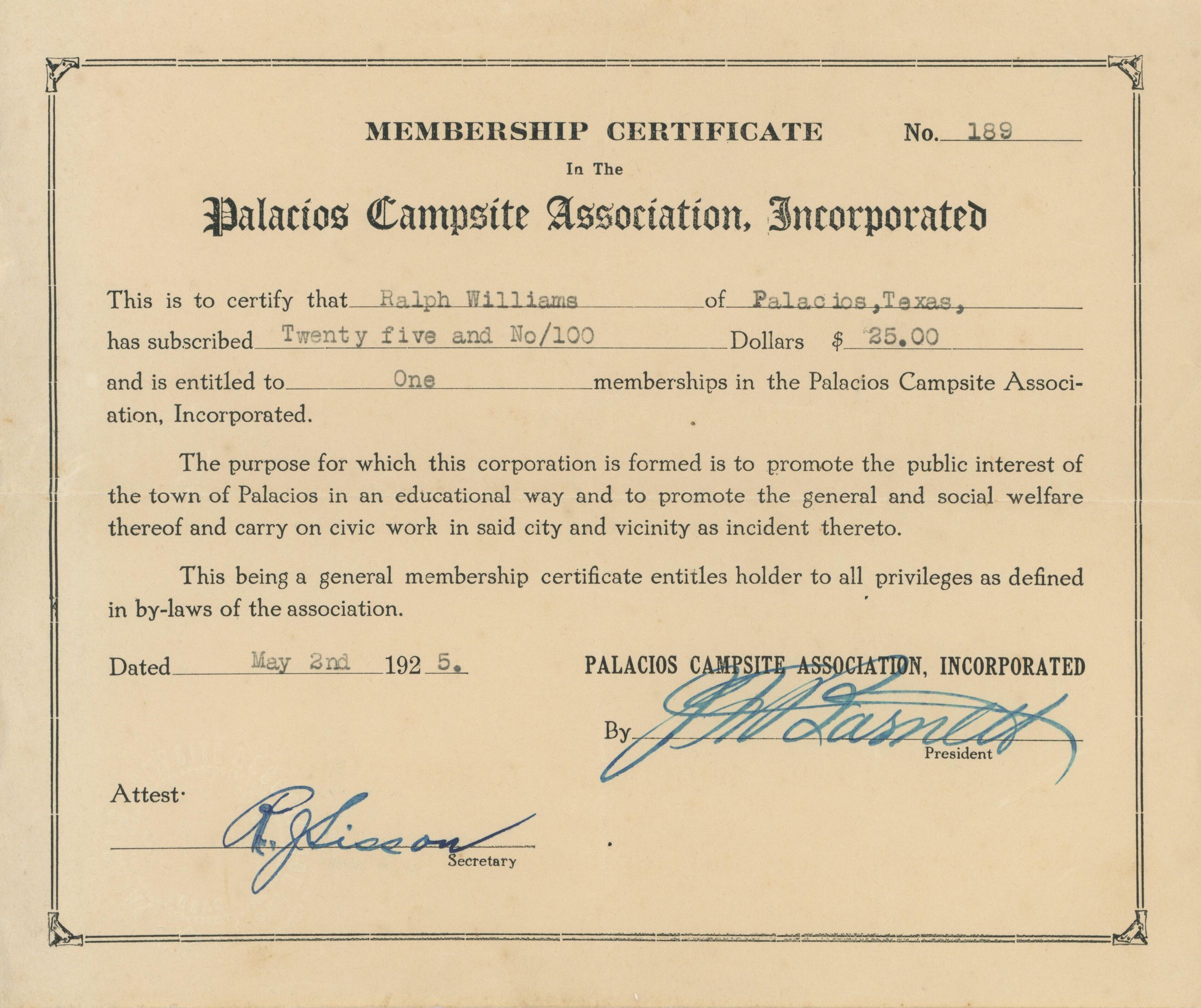 Palacios Campsite Association, Membership Certificate