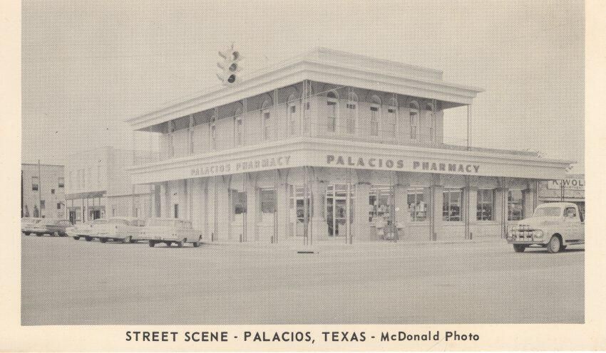 Palacios Pharmacy on 5th and Main Street with cars parked on 5th Street.