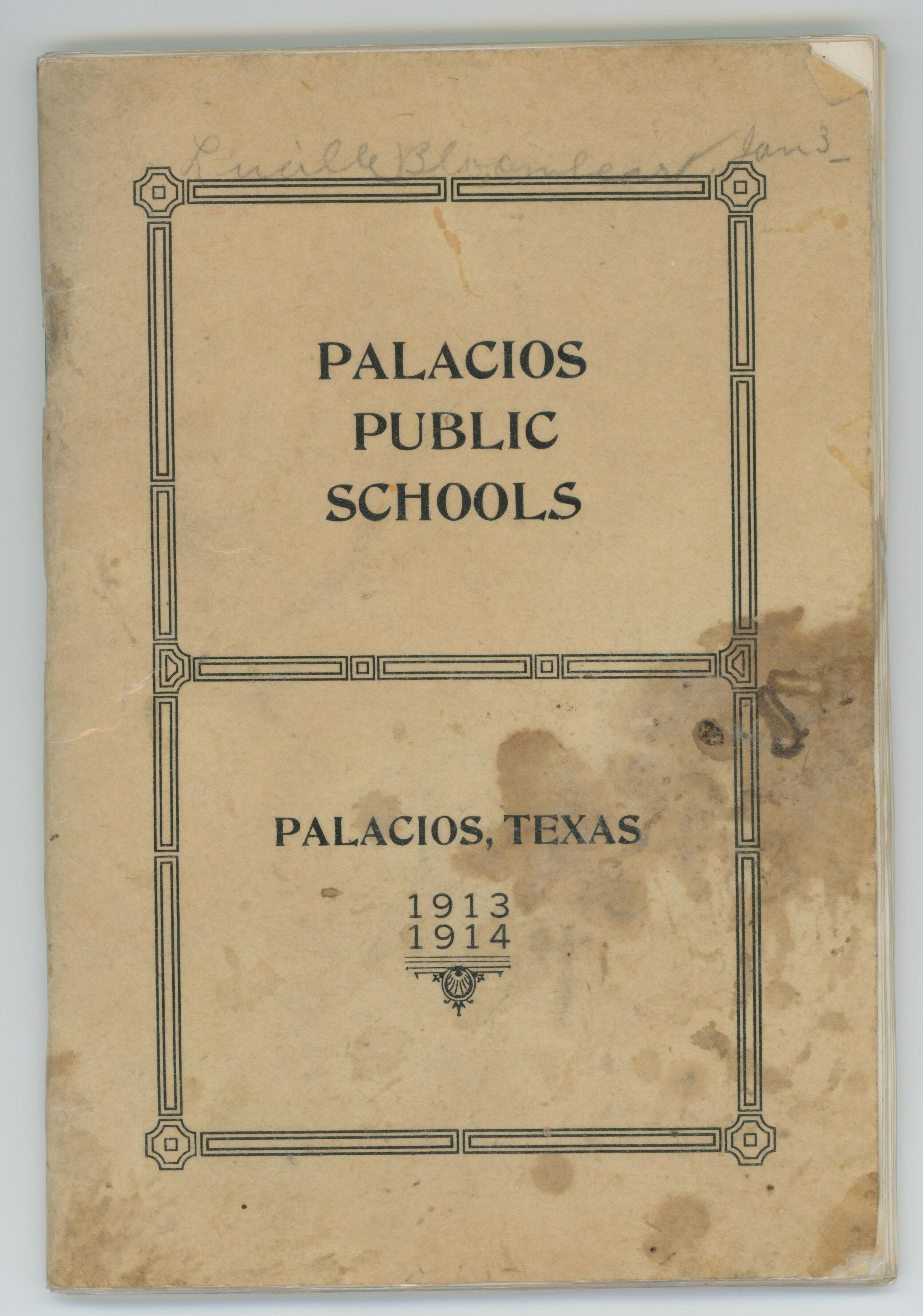 A Palacios Public Schools handbook for the 1913-1914 schoolyear. It is the rules and regulations of the school and has business advertisements.