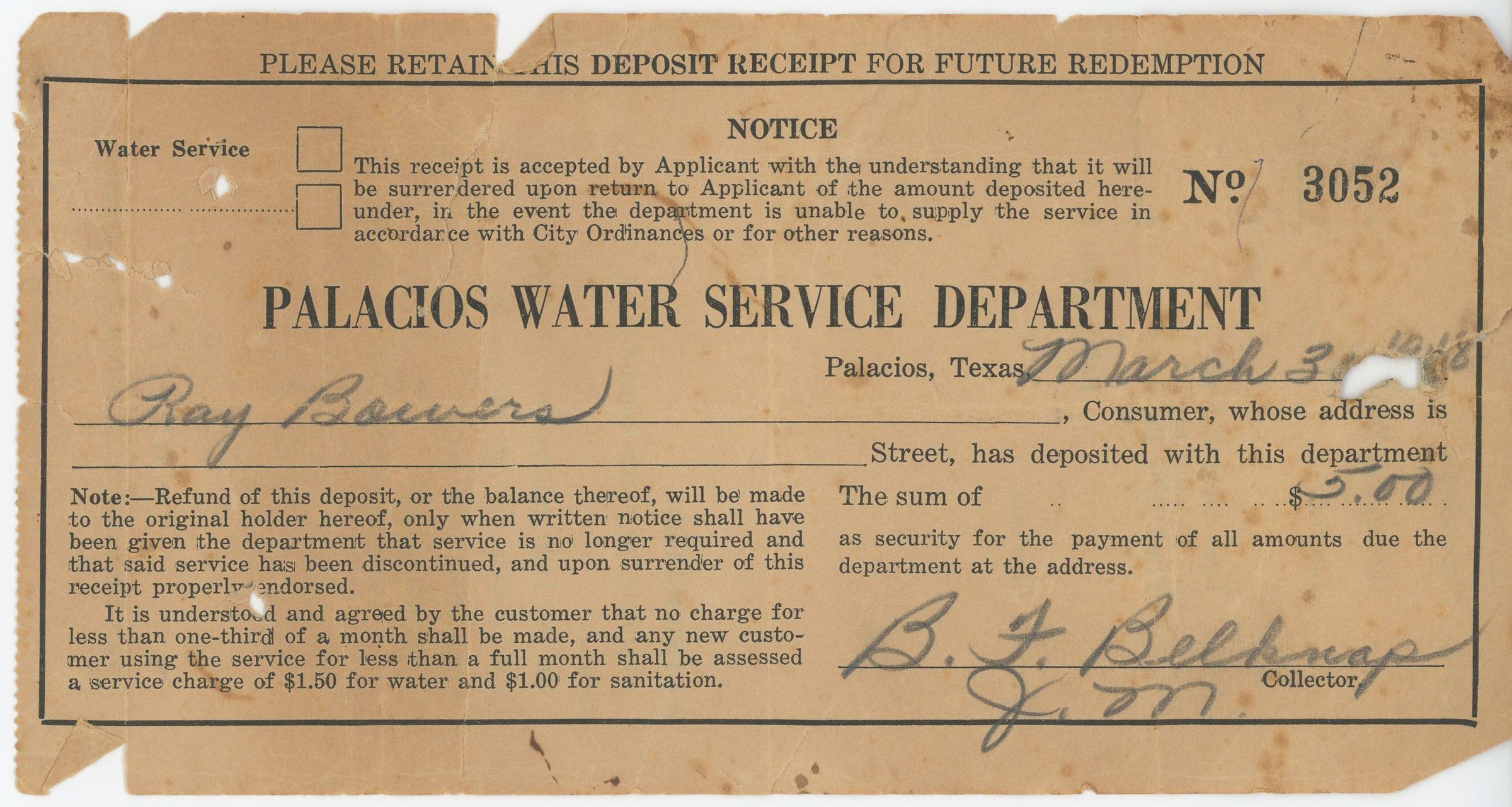 Palacios Water Service Department Receipt