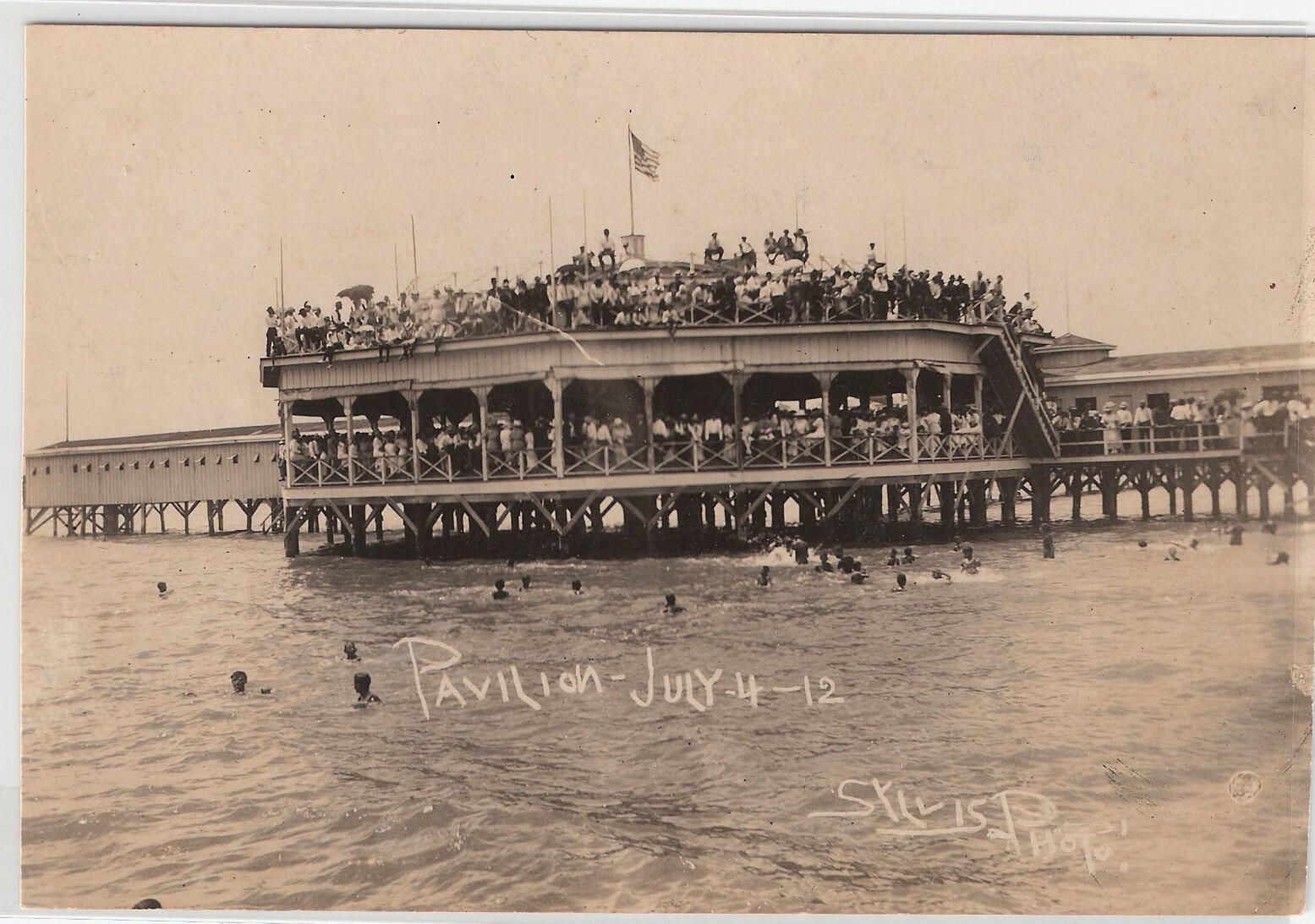 Pavilion, post card, July 4th 1912, people on roof
