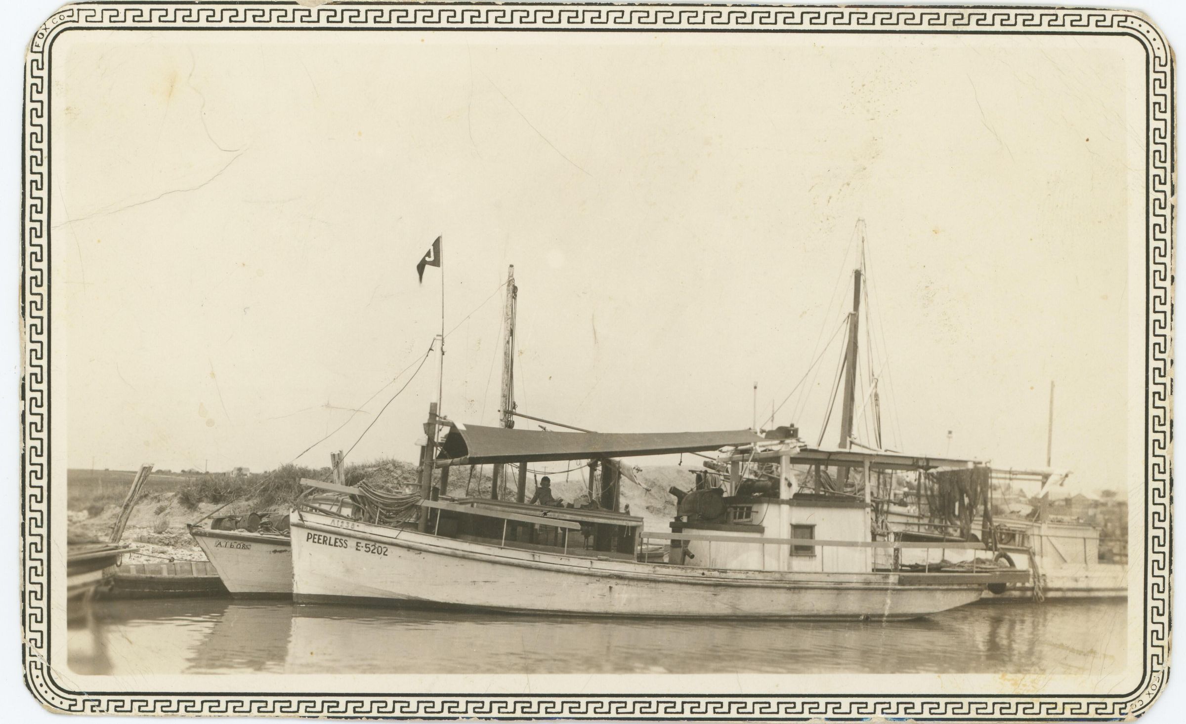 The upper registration--on the gunwale of the "Peerless"-- reflects its original registration in Alabama: A 1230. The unidentified vessel behind the "Peerless" has an Alabama registration of A 1608. (Directly above the bow of A 1608 can be seen, in the distance, the home of the Robert Margerum family in the early 1930s. The house was destroyed by Hurricane Carla in 1961, but the site was in the northwest quadrant of Main and 12th Street intersection.)