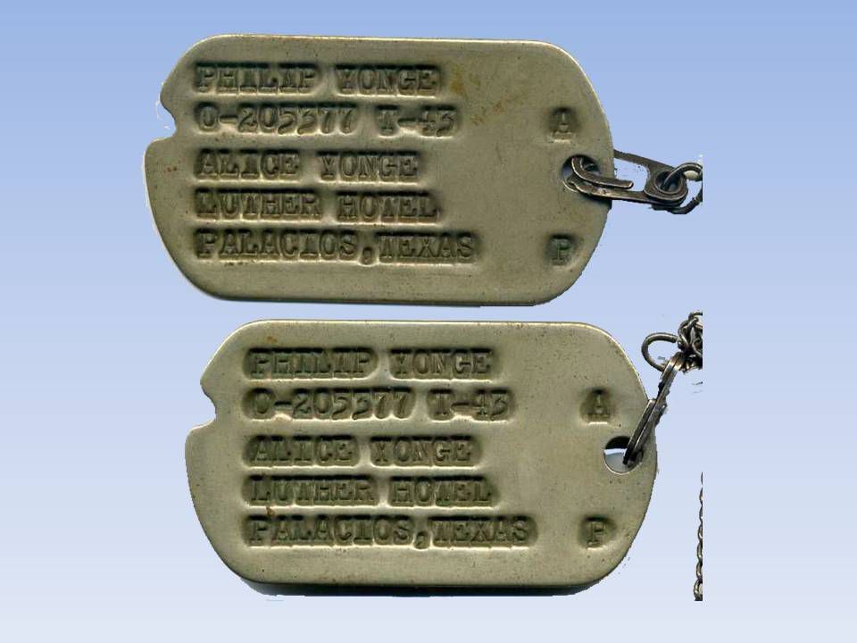 2 dog tags with the inscription: Philip Yonge 0-205577 T-43 Alice Yonge Luther Hotel Palacios, Texas