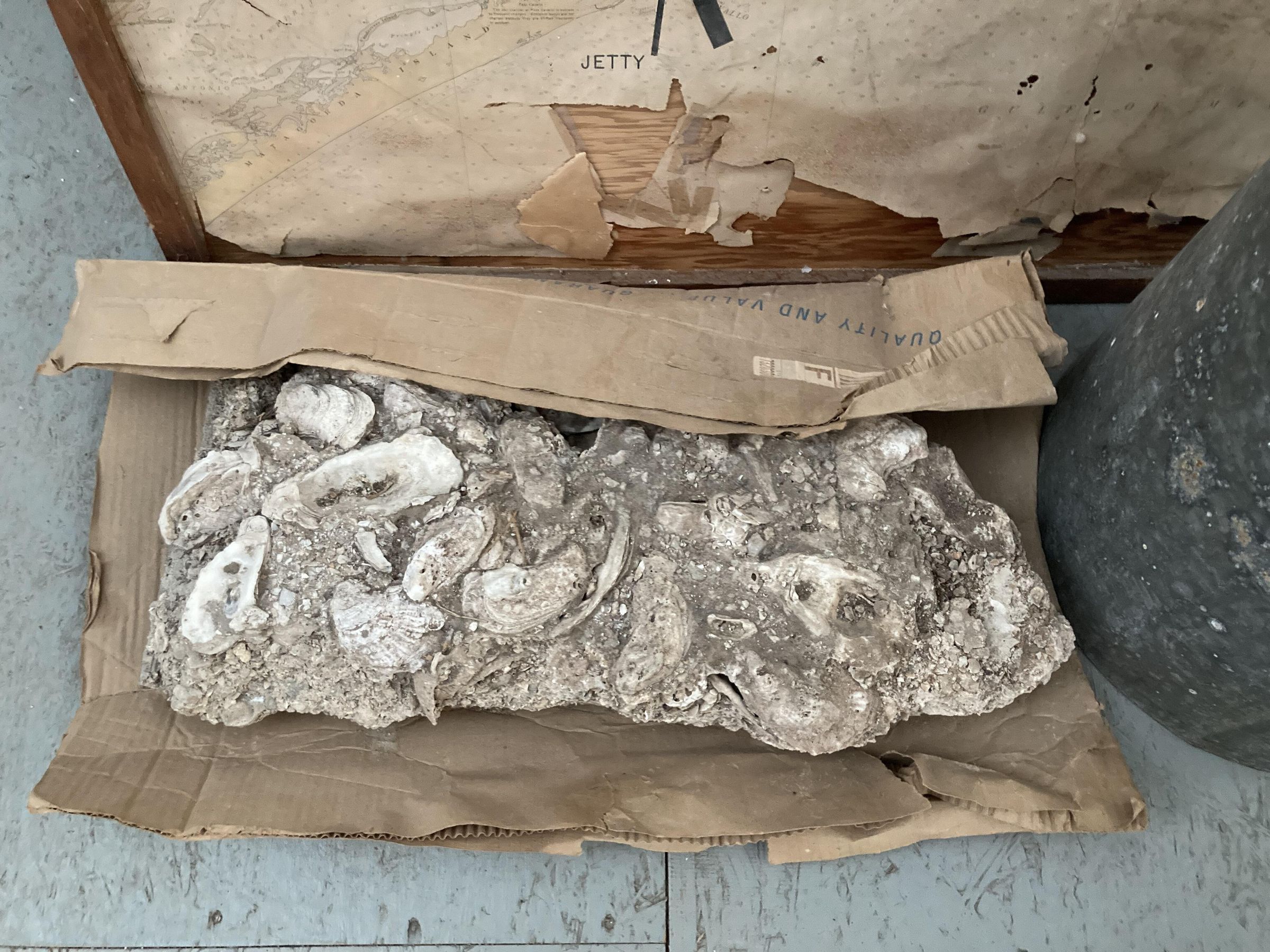 This piece of the sidewalk is made from oyster shells. It was in front of the Trull office and Mrs. Herlin’s home on Welch Street.
