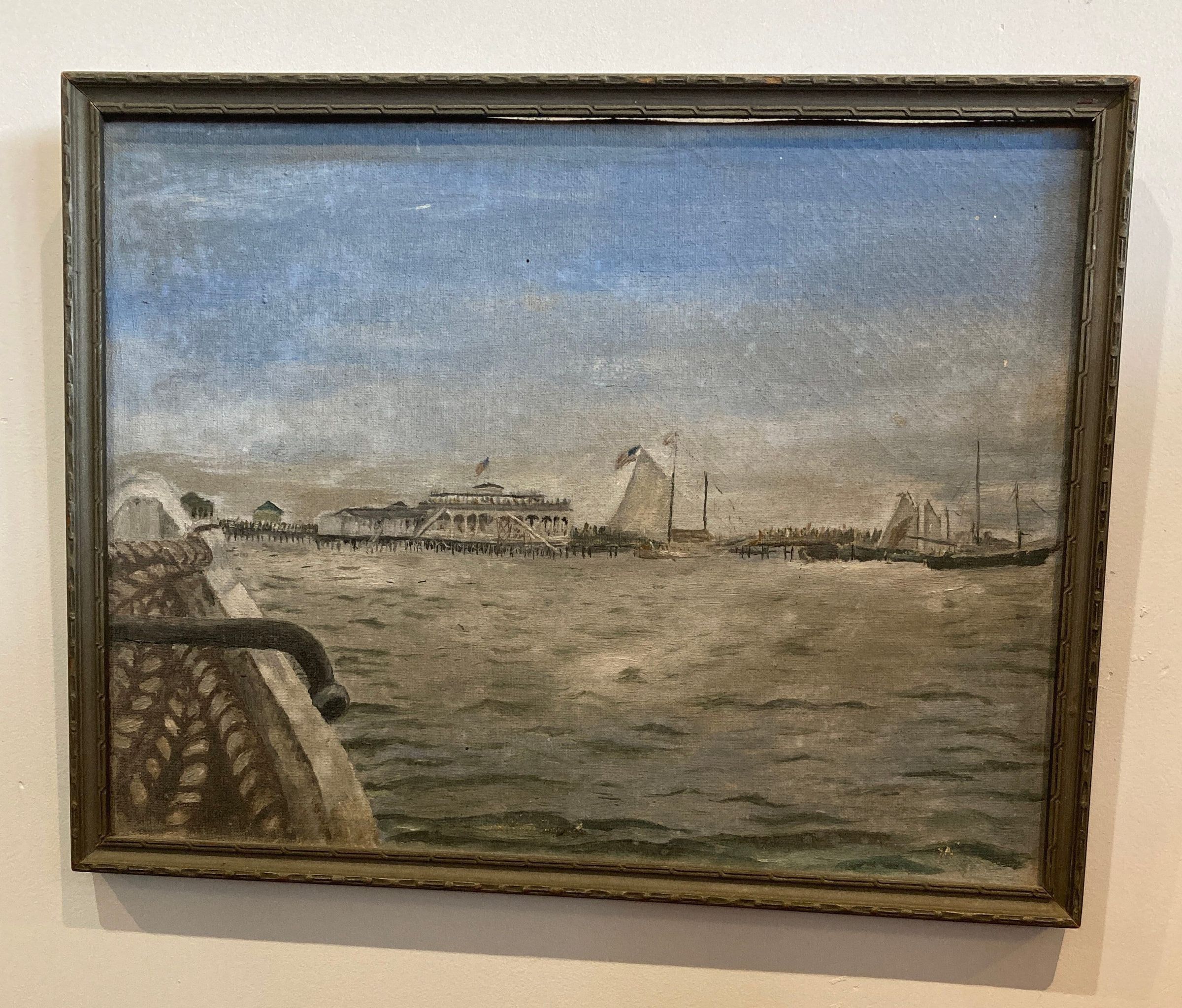 A partial view of a boat with the first pavilion on the bay along with the pier and many other recreational boats. It was gifted to Colleen Claybourn.Type of Painting