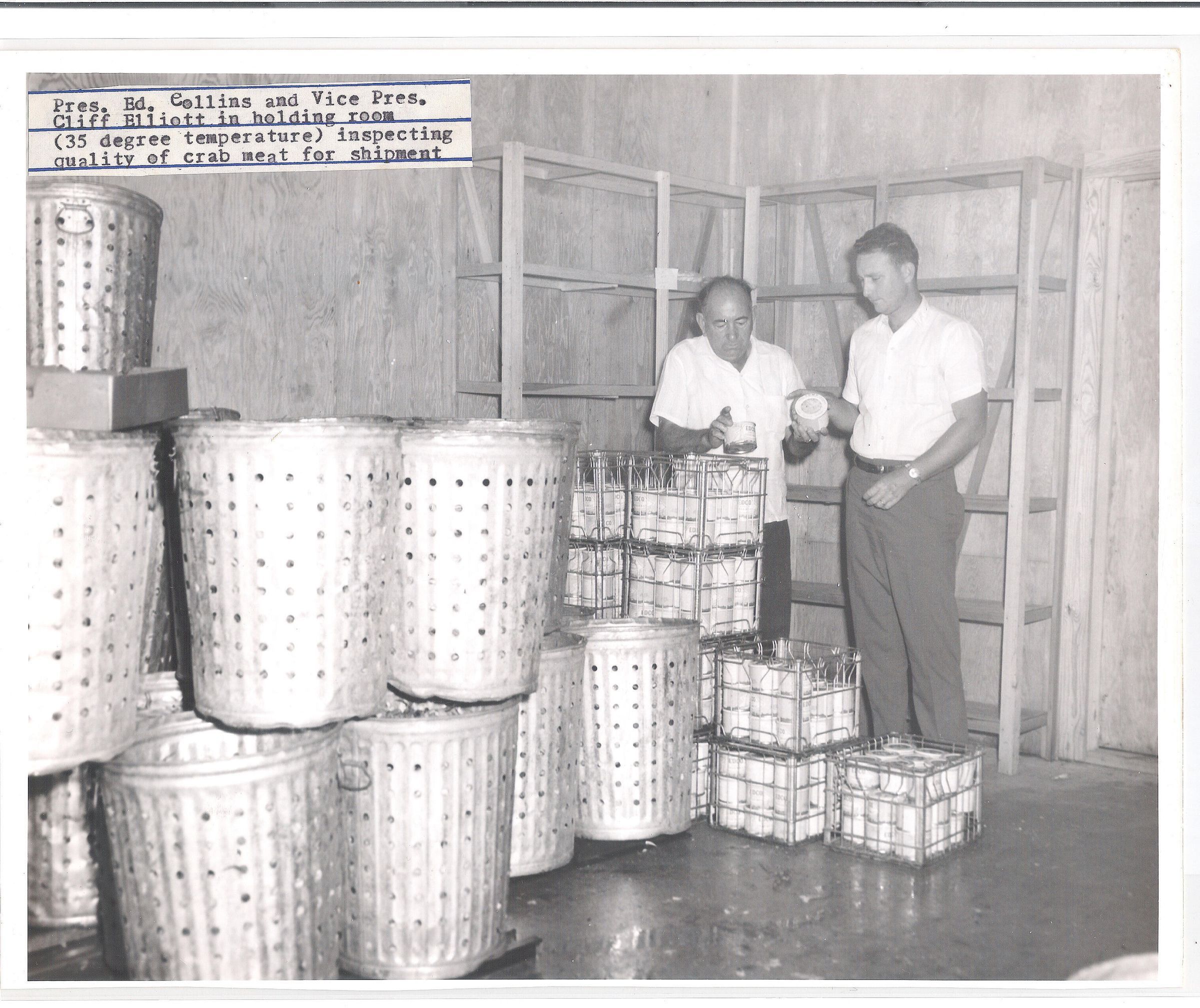 Pres. Ed. Collins and Vice Pres., Cliff Elliott inspecting crab meat