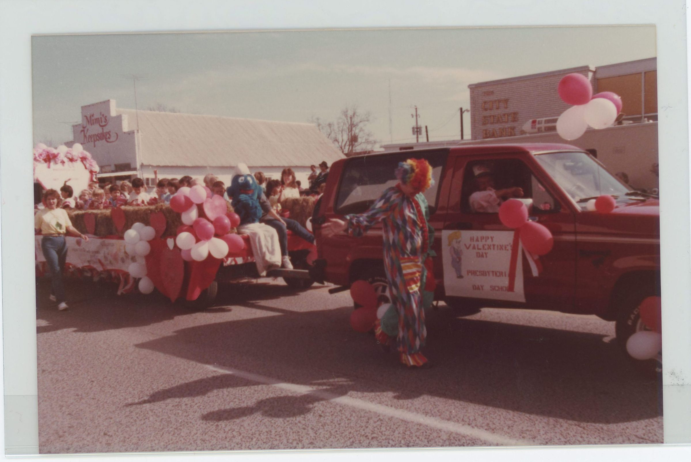 The Presbyterian Day School truck and trailer in the Harmonie Club's Valentine Parade. The trailer had hay with children around it along with pink, red, and white balloons decorating the trailer. Someone dressed as a Smurf is riding the trailer. A clown is walking by the truck pulling the trailer.Collection