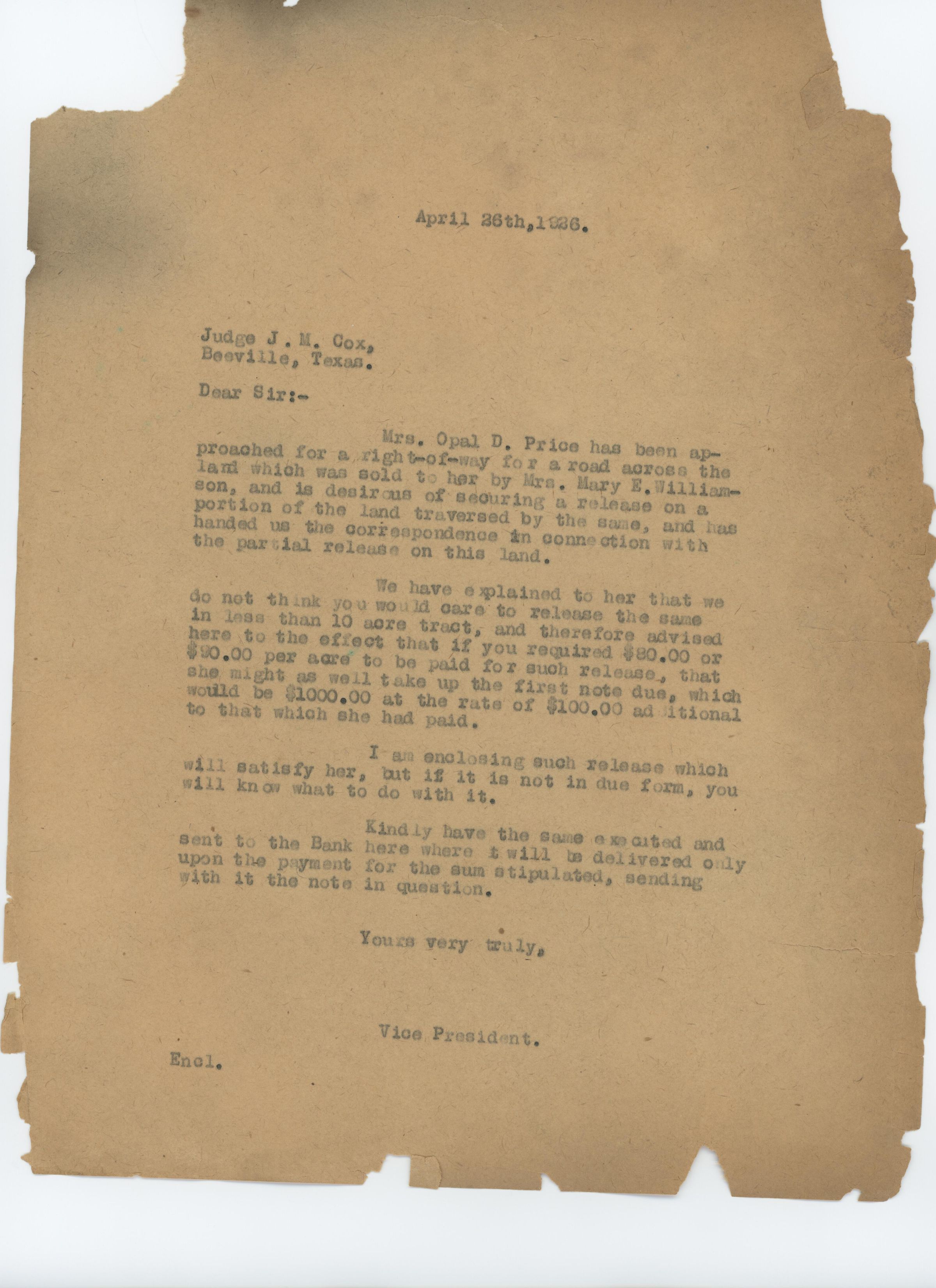 Letter about Mrs. Price's Right-of-Way about the land sold to her from Mary Williamson.Collection