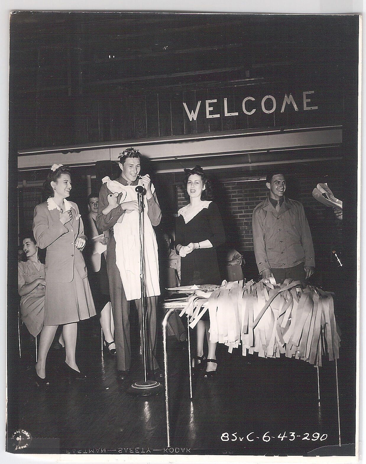 Pvt. Alec Witkowski does a 'baby number' while Dorothy Broughton and Betty Derigo stand by during the Wharton Majorettes dance and variety show held at Camp Hulen Service Club.