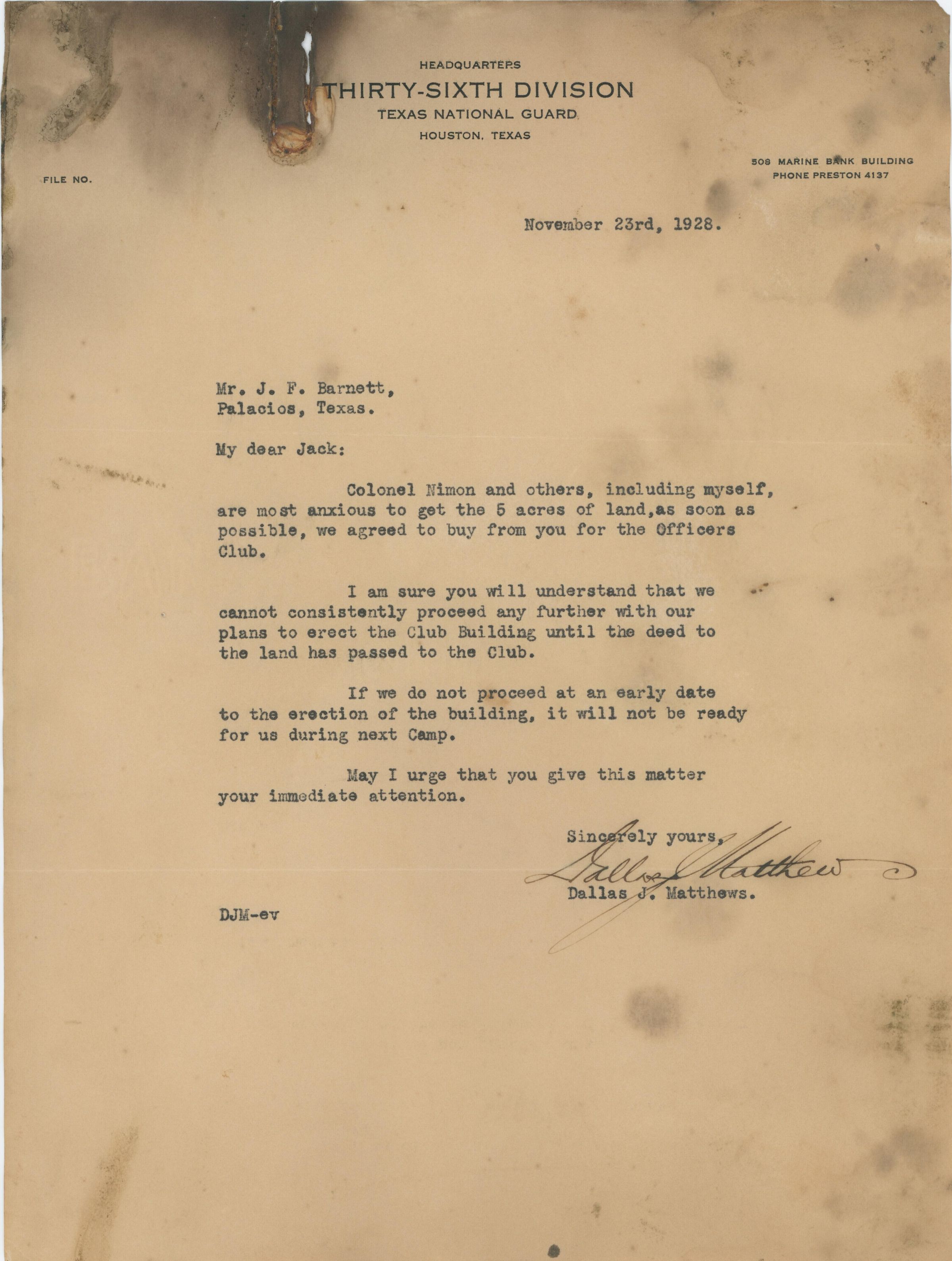 Letter to Mr. Barnett from Dallas Matthews about purchasing 5-acres of land for the Officer's Club.