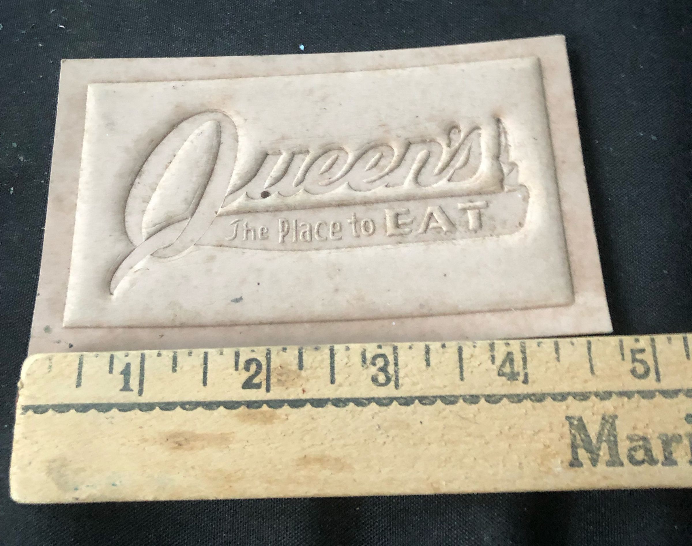 Beige, formerly white, magnet advertising a restaurant called Queen's