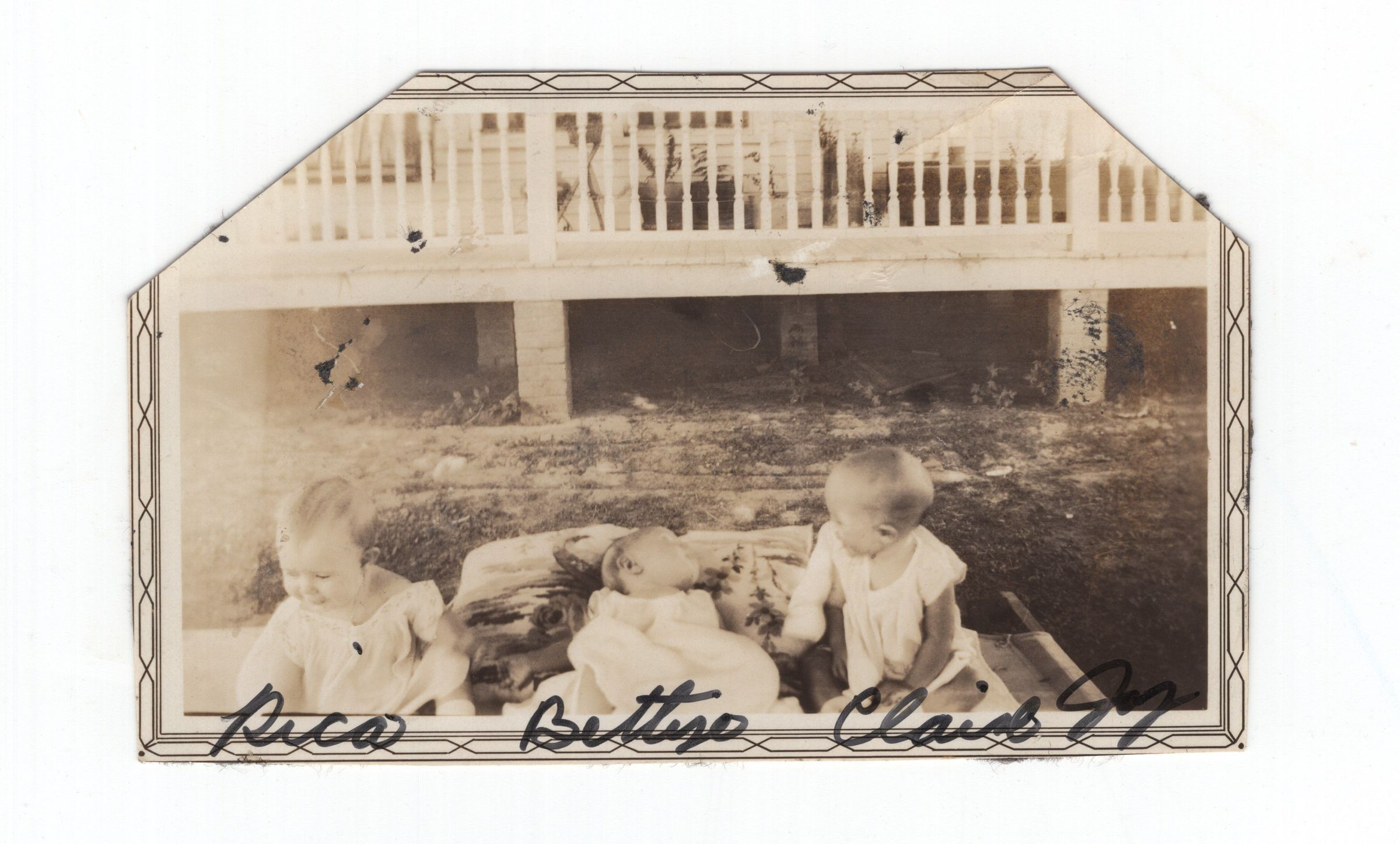 3 babies playing with each other in front of the Luther Family home.