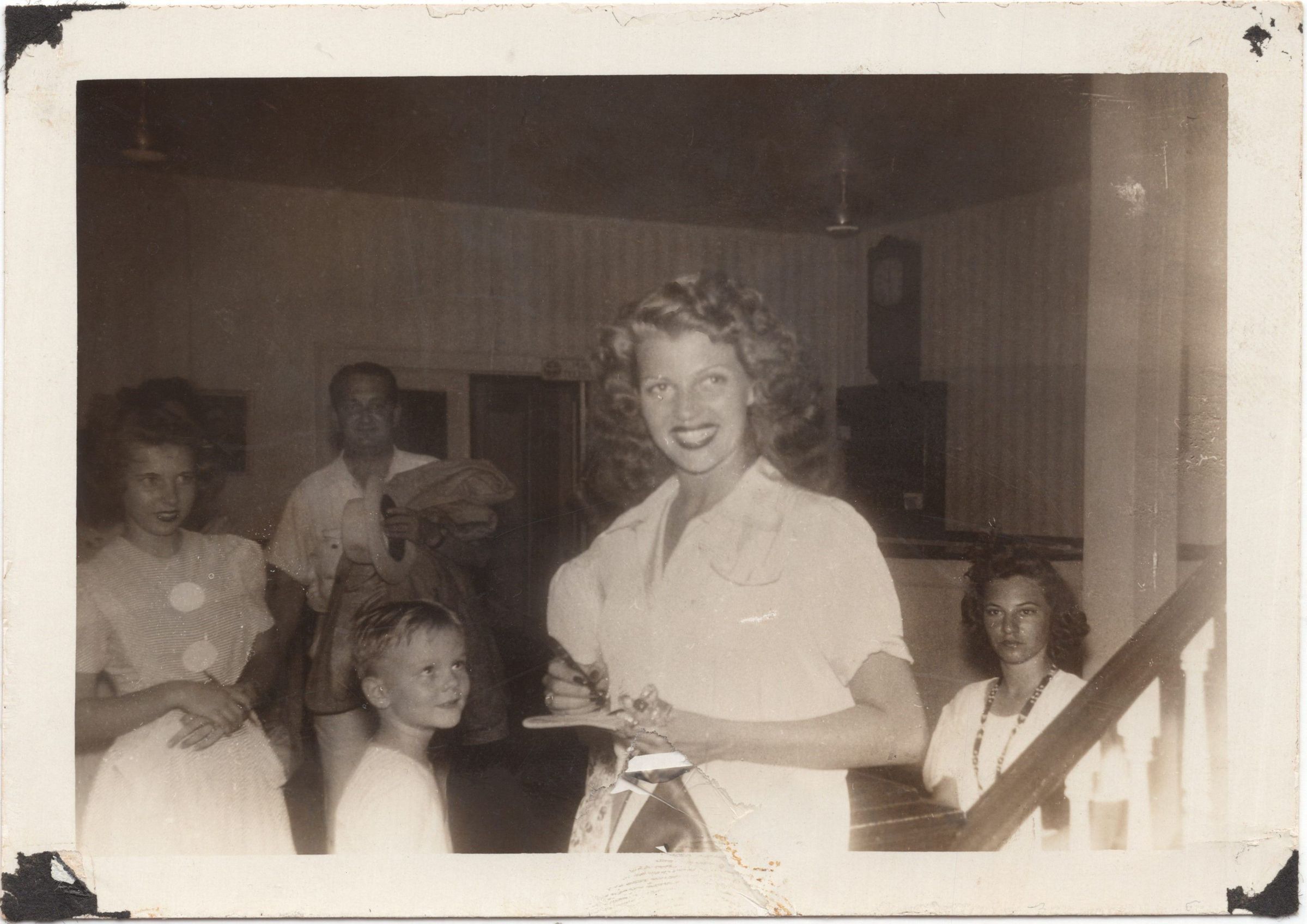 Rita Hayworth standing in the hotel lobby surrounded by guest. Hayworth entertained the troops at Camp Hulen.