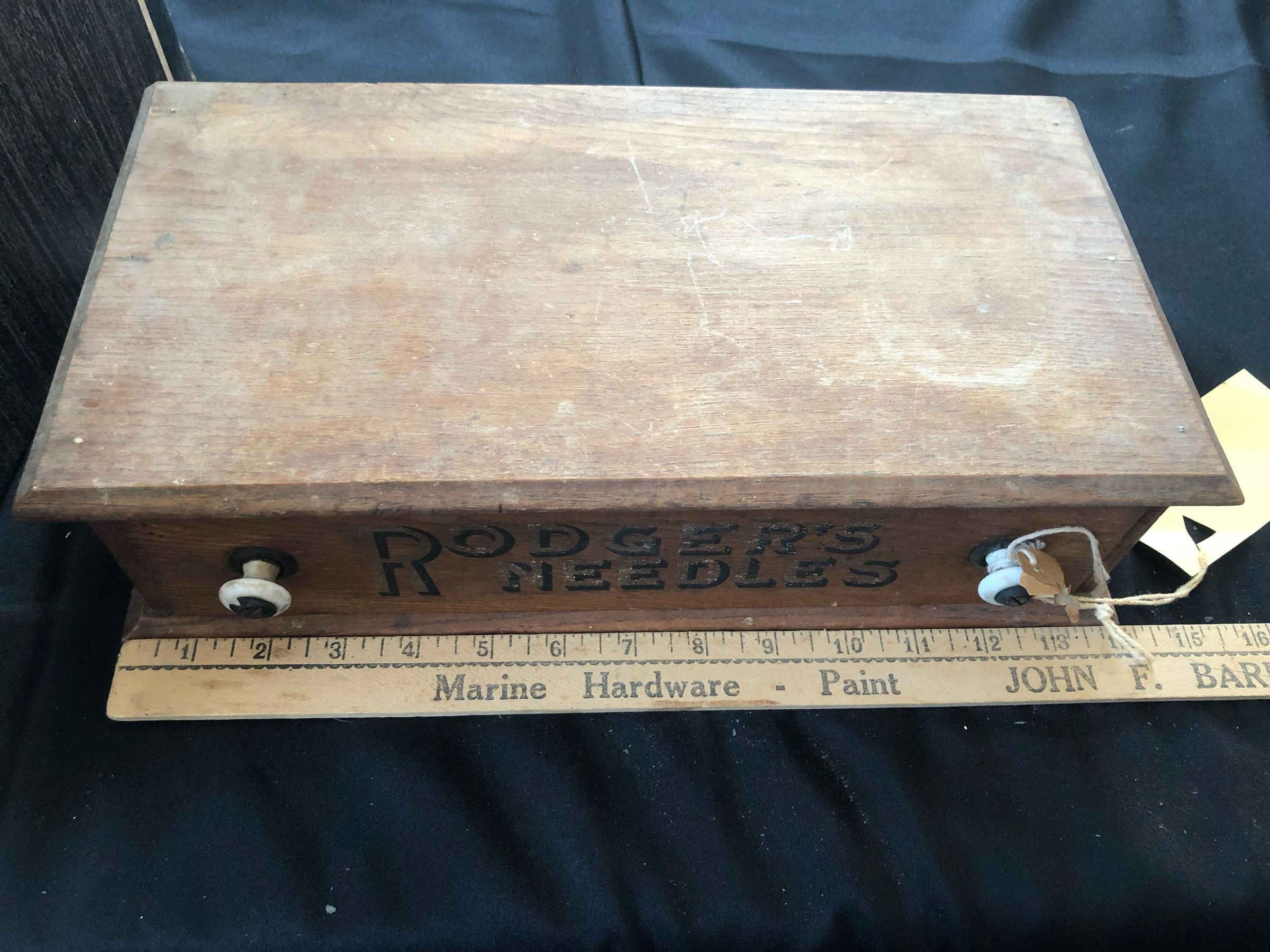 Wooden box with the logo "Rodger's Needles" on the drawer with white handles