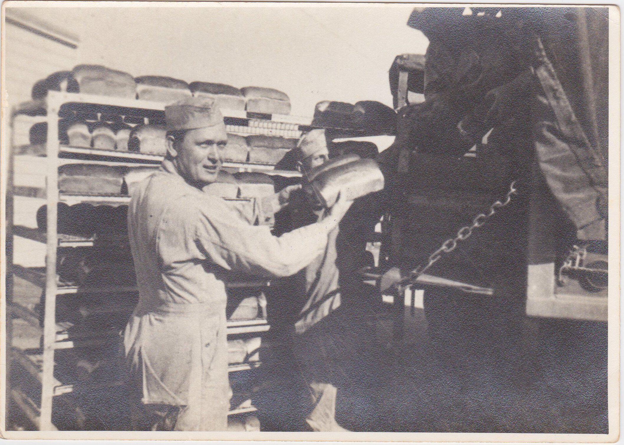 Rudy Klecka from East Bernard, Texas. He is handing a loaf of bread to man on truck.