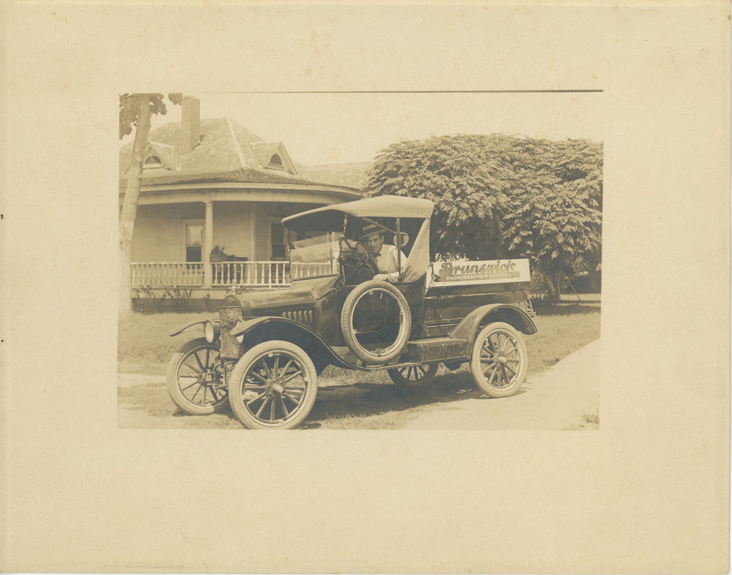 Ruel sitting in driver seat of Brunswick Phonographs Record truck.