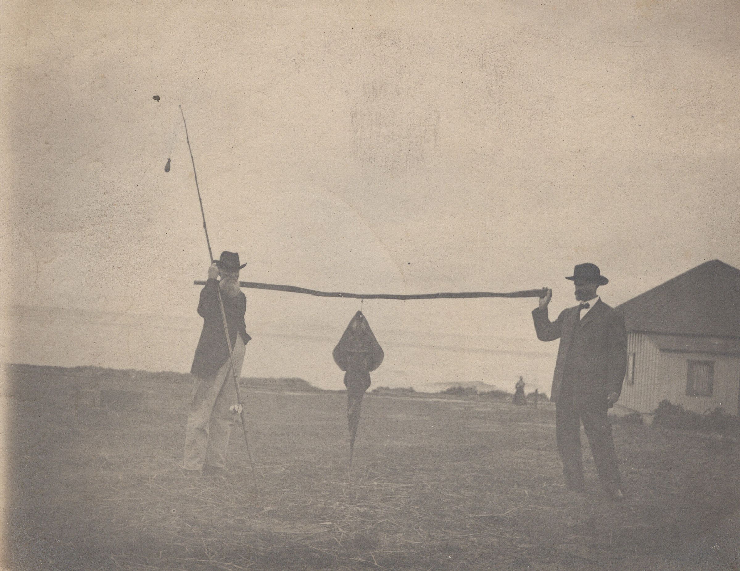 This is a Shovel Nosed Guitarfish caught in the ocean. The one with the fish pole is J.H. Foley.